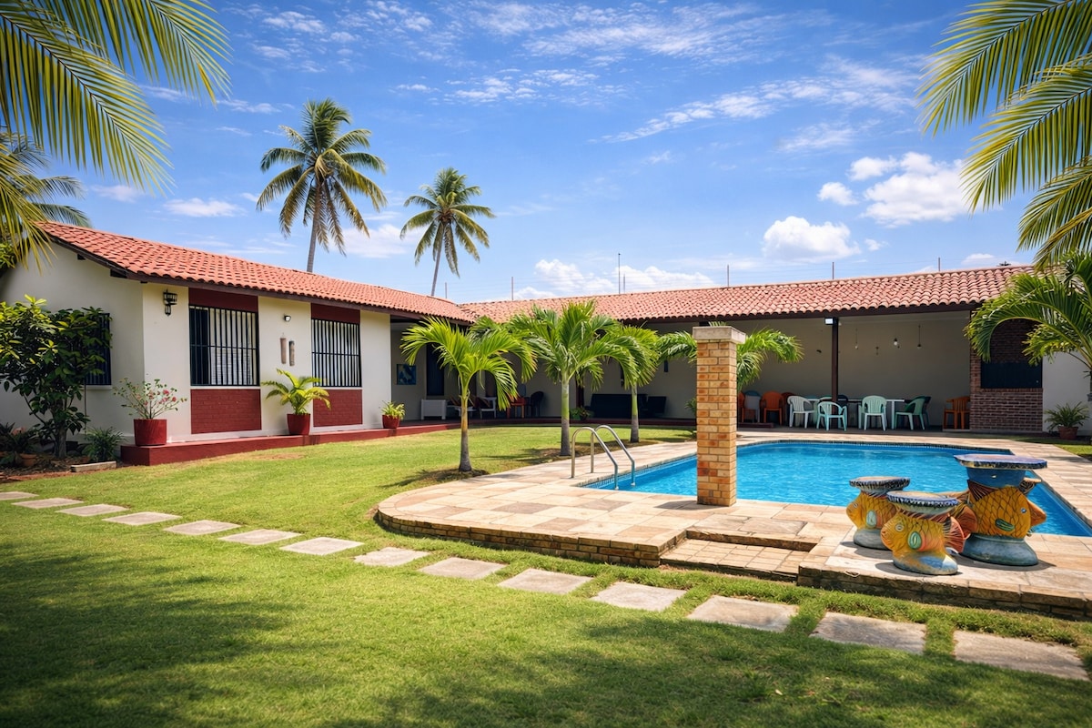 Leve toda a família neste lugar maravilloso!, com muito espaço, planejado e verde, com 45 palmeiras, cajueiros,mangueiras, coqueiros, saputi e outras árvores, em uma área de 2.700M, gramado, Murado, super piscina com raia de 16m adulta, infantil,jacuzzi com hidromassagem,funcionado ; sao 4, suites, sendo 2, térreas e 2, superiores, varandas, amplo espaço gourmet, com sala incorporado , mobiliado com sofá, cadeiras mesa,deck, churrasqueira, estacionamento e nova iluminação, venha relaxar.