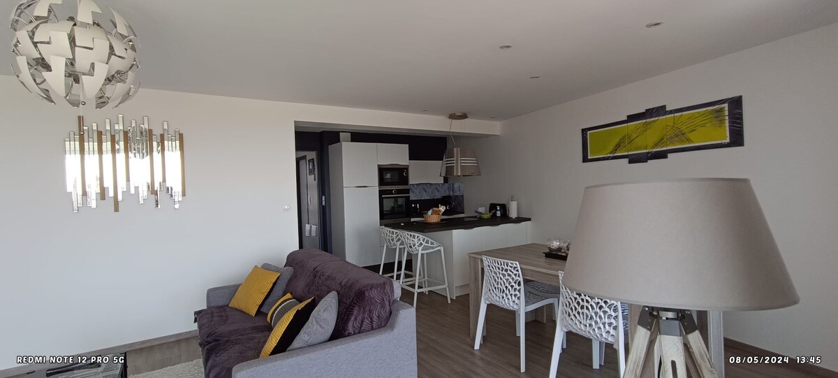 Nahaja se v samem središču Quiberona, vse pa je dosegljivo peš. Udobno stanovanje velikosti 50 m² v mirnem okolju s čudovito teraso, obrnjeno proti jugu, s pogledom na glavno plažo. Velika dnevna soba/kuhinja, spalnica z zakonsko posteljo (king), kopalnica s prho, ločeno stranišče. Popolnoma opremljena kuhinja s pomivalnim strojem, pečico, mikrovalovno pečico, pralnim strojem, aparatom Nespresso in cvrtnikom Airfryer ter terasa z zunanjo mizo in ležalniki. Električna tenda. Zasebno parkirišče. Televizija, HiFi radio, internet. Posteljnina je vključena za bivanja, ki trajajo najmanj 7 noči
