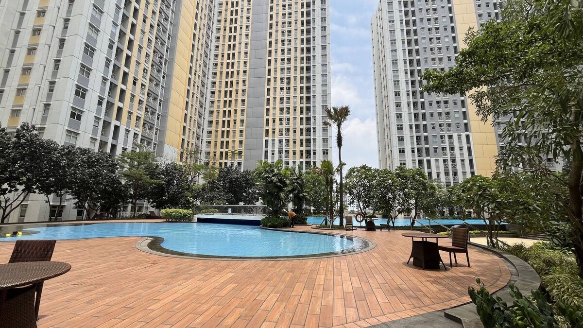 Ta enota se nahaja v stolpu Davallia. Popoln kraj za sprostitev z družino ali druženje s prijatelji. Pogled na bazen vam ponuja osvežujoč razgled na ta stanovanjski kompleks. 5 minut hoje do Kopi Nako in drugih elegantnih restavracij/ kavarn 10 minut hoje do nakupovalnega središča Summarecon Mall Bekasi skozi predor.