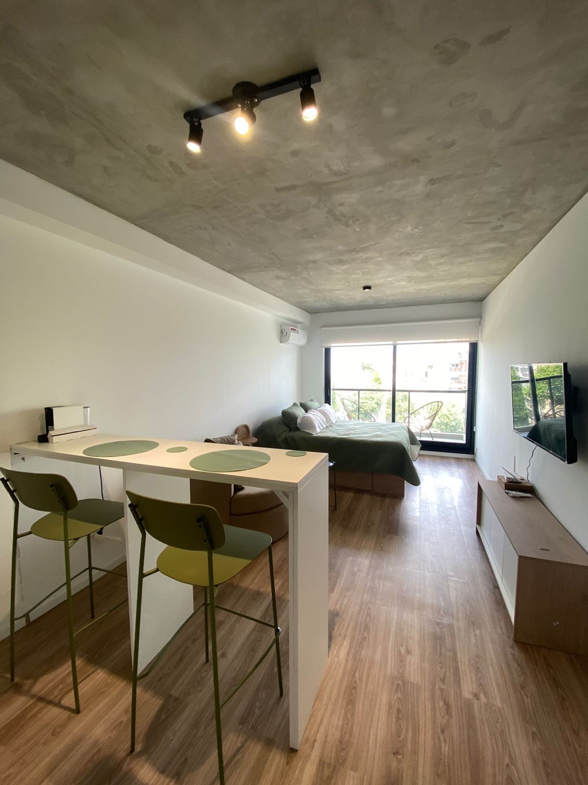 Welcome to our modern studio apartment strategically located meters from Palermo Hollywood. Enjoy the sophistication and comfort in this brand new space, equipped with everything you need for a perfect stay. The complex has top-notch amenities such as coworking and a complete gym to make your stay unforgettable. Its central location puts you close to restaurants, points of interest and transportation. You are welcome to live the city with style!!