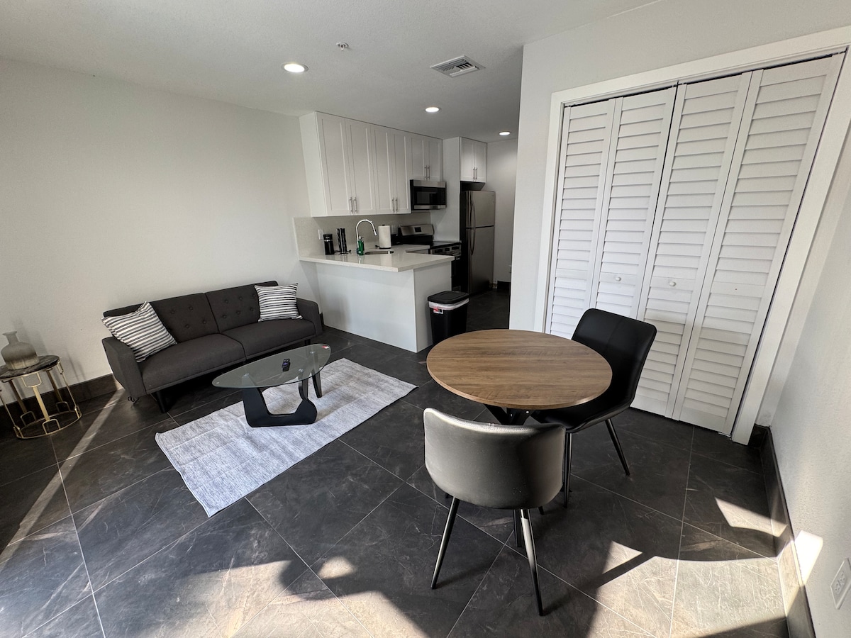 Razkošen zasebni studio z zasebnim vhodom (440 kvadratnih čevljev - lahko sprejme 3 osebe/2 avtomobila) je pritrjen na naš dom in 1,7 milj od plaže in v bližini plaže Ft Lauderdale. Parkirajte pod pokritim nadstreškom. 1 zakonska postelja (& 1 zakonska postelja), 1 kopalnica, čajna kuhinja, optični Wi-Fi, TV z ravnim zaslonom (140 kanalov), udarna okna, ogromna omara, ventilator/luč, klimatska naprava z daljinskim upravljalnikom, pisalna miza, stol, zložljiva miza za uživanje s stoli, majhen hladilnik, mikrovalovna pečica, opekač kruha, žar, kuhalna plošča, štedilnik na kuhalni plošči, aparat za kavo.