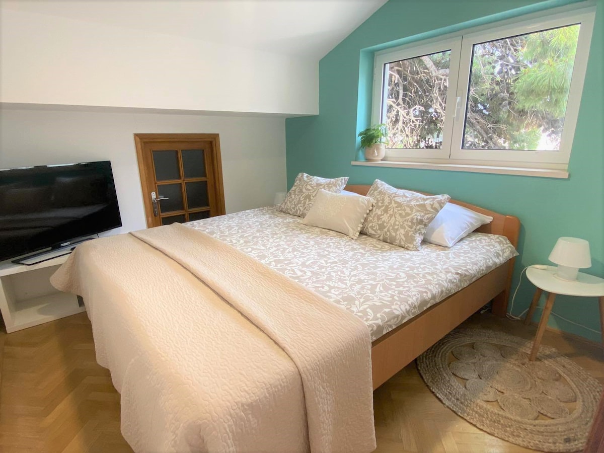 Apartment is situated on a quiet street with a spectacular view. It is comfortable for two, but also has aditional bed in the living room. Beach, restorant, bus station, store and tennis courts are just 3-5 min walk. The distance from the Old Town is 15-20 min walk.