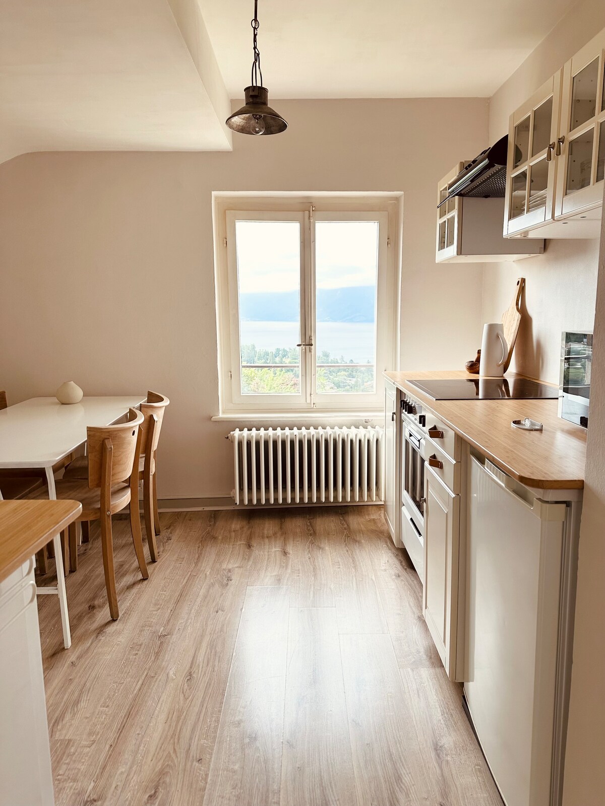 Flat entirely renovated and newly furnished, at the 3rd floor of an old villager house, close to Lausanne. Quiet, traversing with wonderful view on Geneva Lake and Alps! Living and dining room, bedroom with double bed 180cm, fully furnished kitchen, side bedroom with 2 single beds, bathroom with bathtub, hall with small desk. Laundry with washing machine and dryer at disposal. Balcony.