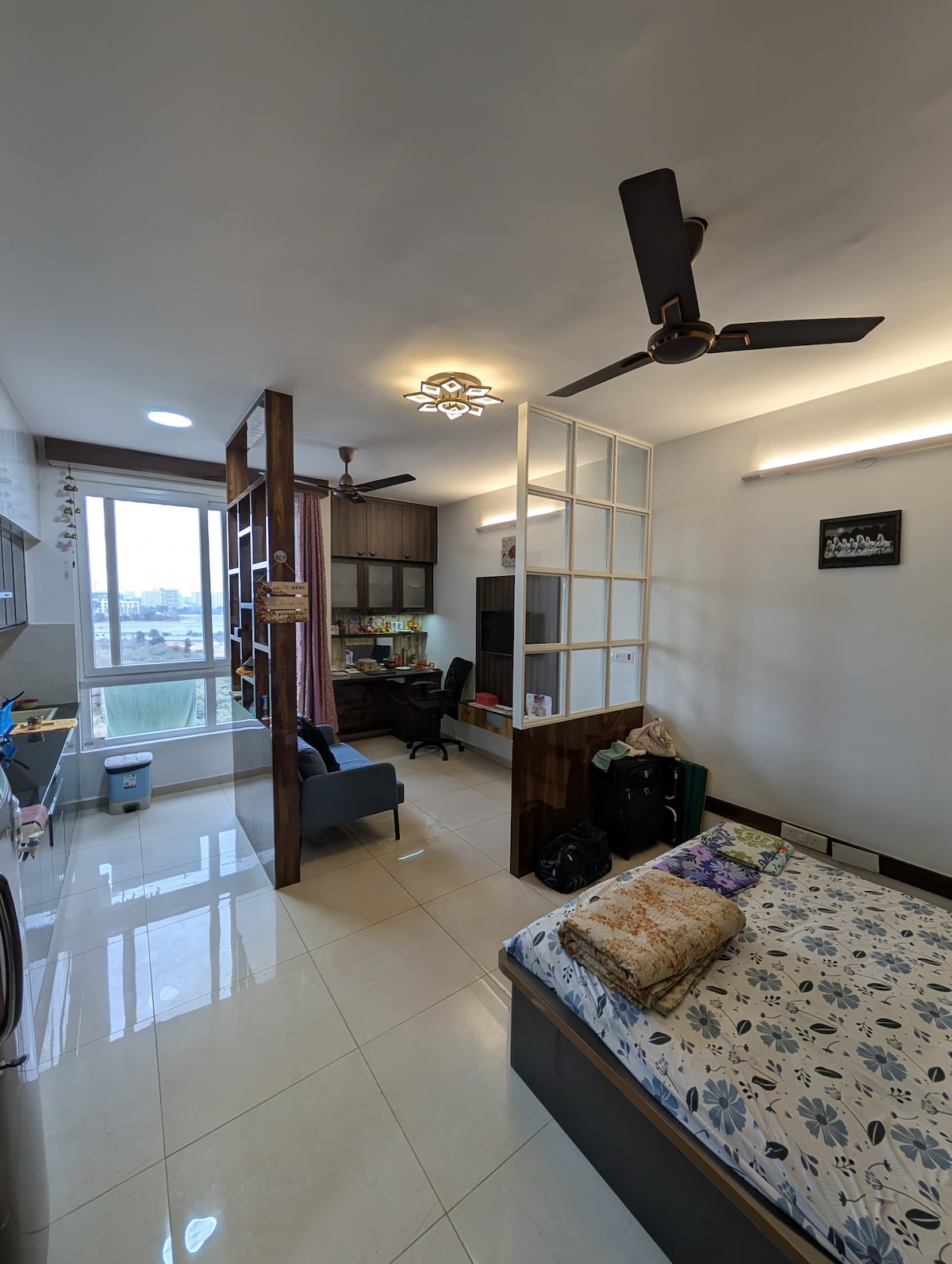 Uživajte v elegantnem doživetju v tem bivališču, ki se nahaja v središču mesta. Bivajte v sodobni, popolnoma opremljeni sobi v prostornem stanovanju. *Klimatska naprava z elegantnim dekorjem in vrhunskim pohištvom * Namenska delovna/študijska pisalna miza in ergonomski stol za delo ali študij na daljavo * Sodobna kopalnica s pametno električno komodo *Velik bivalni prostor za sprostitev ali udobno delo * Hitra povezava Wi-Fi – idealna za poslovna potovanja ali službena potovanja