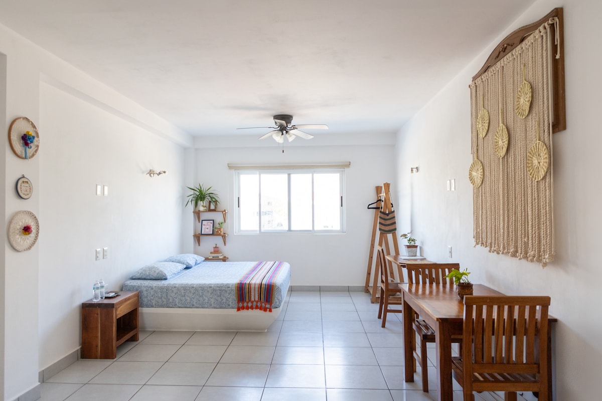 Just a 2.2. Km walk from the Puerto Juárez beach is this private studio located, ideal for getting to know the downtown area of Cancun and the quietest beaches in the area. You'll find just a steps away a local market, restaurants, coffee shops and the bus stop that will take you everywhere. - A solo 10 minutos caminando de la playa Puerto Juárez se encuentra este estudio privado, ideal para conocer la zona centro de Cancún y las playas más tranquilas de la zona.