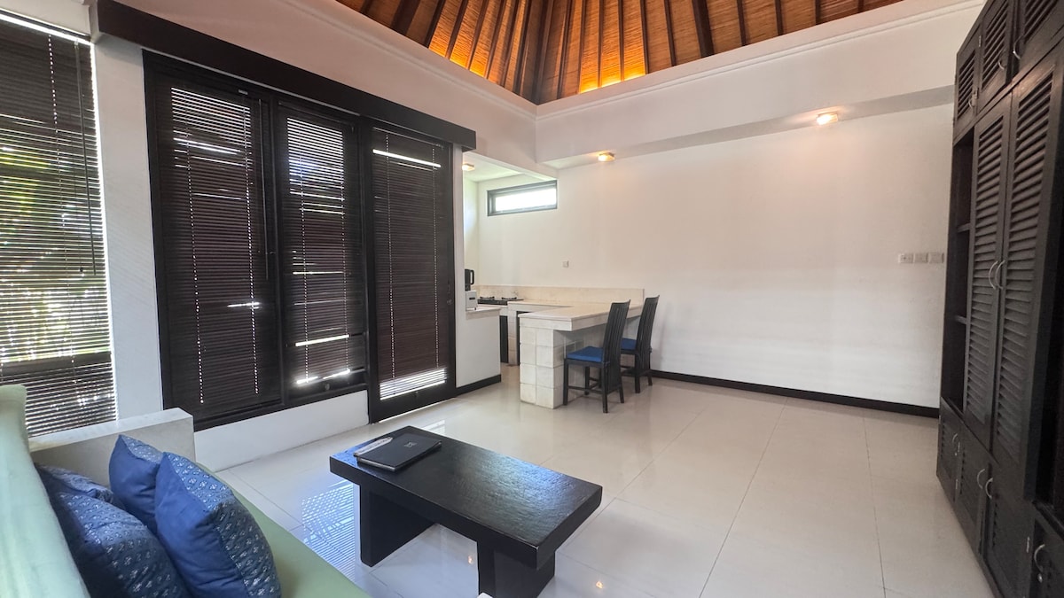 This room is a spacious and luxurious apartment measuring 87 square meters. It features a king-size (wide 240 cm) canopy bed, with an option to request hollywood twin beds. The expansive outdoor bathroom includes a terrazzo bathtub with a view of the sky and a dressing space. The living room, designed in Balinese style with high ceilings, comes with a fully equipped kitchen. In front of the terrace, you'll find public swimming pool. Capacity: 2–3 guests (extra bed available upon request).