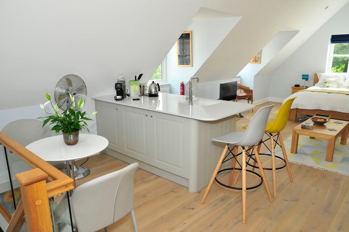My Studio Apartment is bright and airy perfect loft style living in the Historic Market town of Berkhamsted. Studio je enako oddaljen med mestom in državo, golf klub Berkhamsted pa je oddaljen nekaj več kot 5 min hoje, medtem ko je High St z obilico elegantnih kavarn, butikov in restavracij oddaljen 12 min hoje. Kanal Grand Union je 10 min hoje po hribu s številnimi pivnicami ob kanalu, ki so oddaljene nekaj ur. Postaja Berkhamsted je oddaljena 12 minut hoje, v Londonu pa boste v 30 minutah