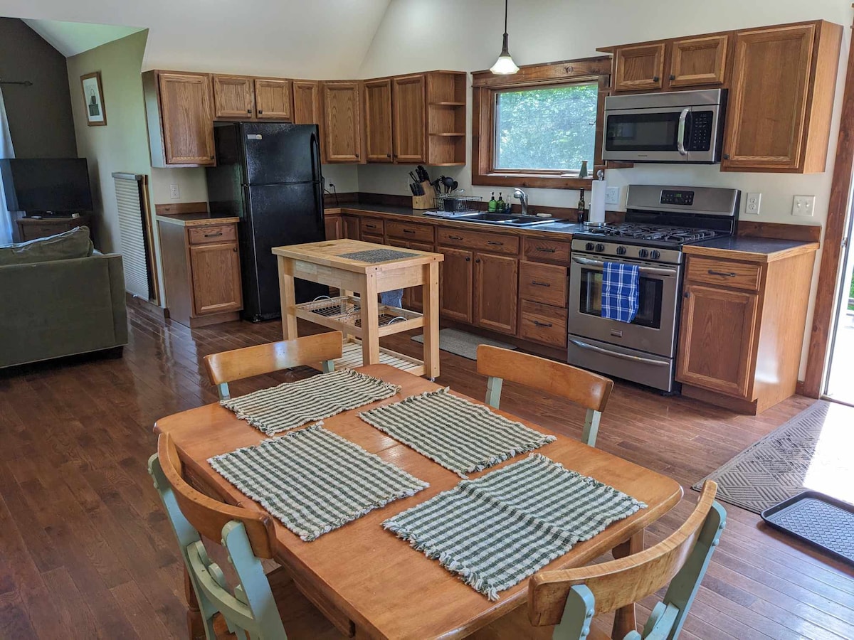 Uživajte v naši odmaknjeni koči, ribniku in območju za piknik s številnimi hektarji za tavanje. Počitek je enostaven z zasebnostjo in mirnim gozdom, ki je prizorišče na novo prenovljenega počitniškega prostora naše družine. Na zahtevo sta na voljo največ dve otroški posteljici (prinesti morate svojo posteljnino).) Udoben prostor za največ 4 goste. Naša udobna koča je popolna priložnost, da se izklopite iz vrveža življenja, opremljena z Wi-Fi-jem, vendar zelo redkim sprejemom v kleti. Funkcija klica Wi-Fi se lahko uporablja za pomembne povezave.