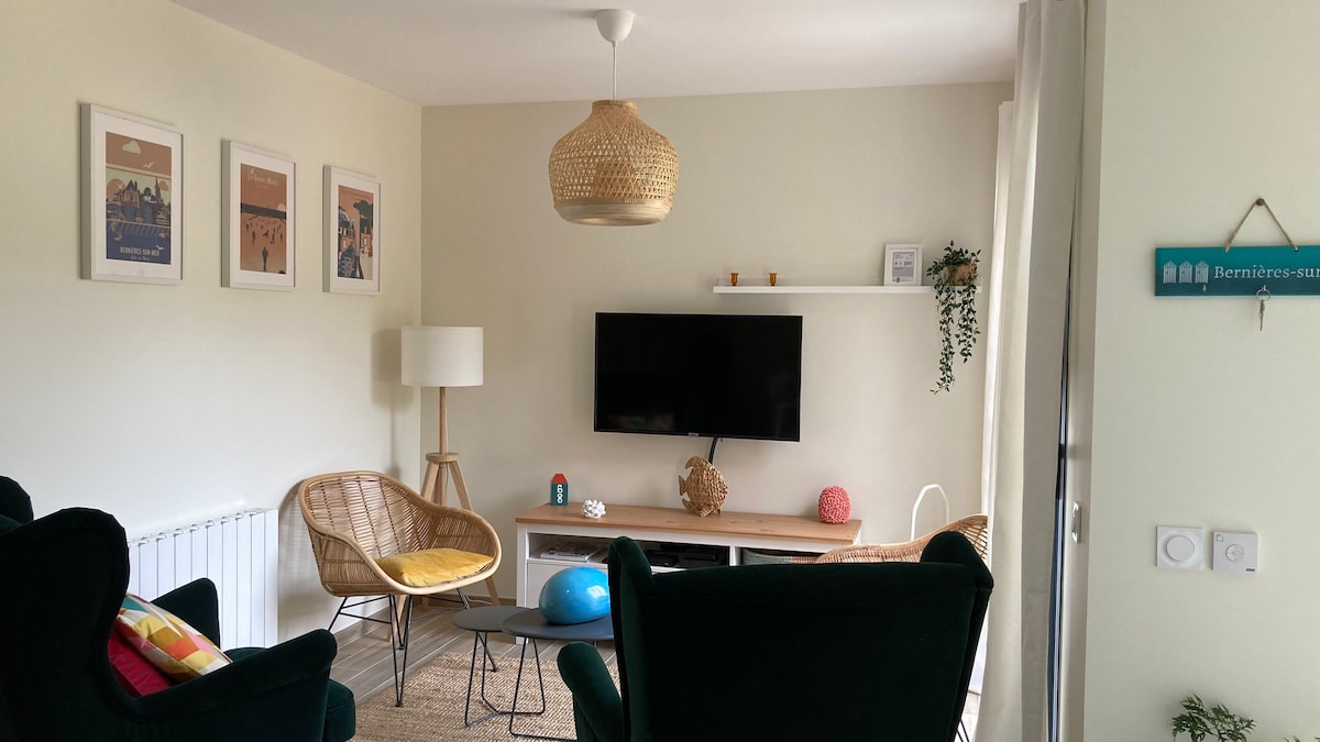 Apartma dupleks, 1. nadstropje, ki se nahaja v Bernières-sur-merju. Majhen vrt, zelo sončen, v skupnosti. 200 m od plaže Juno! Nastanitev, ki je idealna za dve ali družinski kokoni, lahko udobno sprejme 6 oseb. 2 spalnici. 4 postelje : velika zakonska postelja, raztegljiv kavč in dve postelji velikosti 80 cm, ki ju je mogoče prilagoditi veliki zakonski postelji. Brezplačno omrežje Wi-Fi Vse za dojenčke, vse v kuhinji Vse udobje v vsaki sobi ! Kmalu se vidimo. Rjuhe/brisače niso na voljo. Na zahtevo z doplačilom.