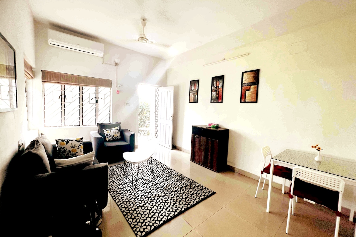 This charming two-story bungalow near BB-BC Park in Salt Lake,blends modern comforts with nostalgic charm. It’s a 10-minute walk from City Centre and a short drive from Sector V making it ideal for vacations or work trips.The ground-floor apartment features a queen-sized bed, retro-modern en-suite bathroom,a fully-equipped kitchen & a cozy living area with a private balcony.Guests enjoy secure access, high-speed Wi-Fi, air conditioning,smart TV, optional parking, & terrace access and paid meals