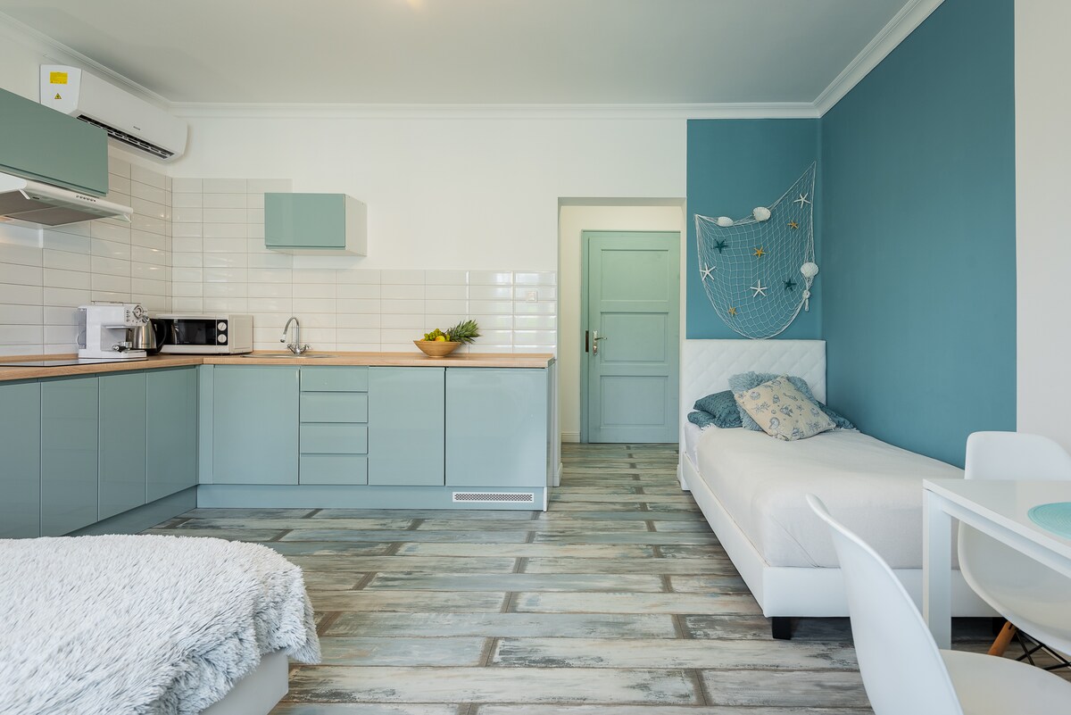 Marine Apartment - turquoise, white, wood and marine accessories create the atmosphere of the apartment. The apartment has been designed for a maximum of 3 guests. The fully equipped kitchen has an induction hob, a dishwasher, a microwave, an electric kettle, pressure coffee maker and other kitchen utensils. In the bathroom you will find a hairdryer and a set of necessary cosmetics.