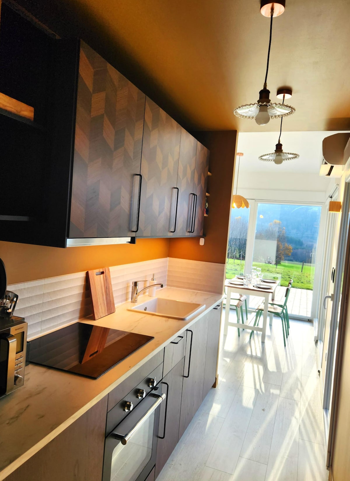 Udobna in dizajnerska koča v bližini jezera - pogled na gore