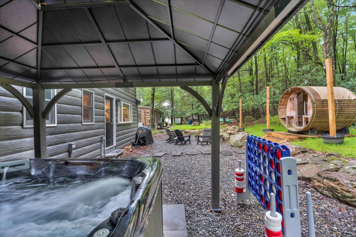Pocono Escape: savna, masažna kad, igralnica, kurišče, Tesla
