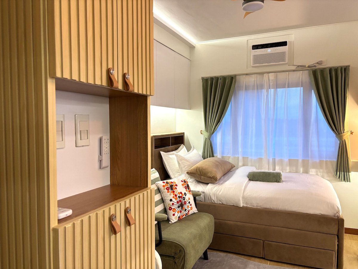 Professionally Designed Studio Unit with Relaxing View at Holland Park, Southwoods City • 5-minute walk or 350m to St. Nino de Cebu Parish Church • just across Southwoods Mall • double bed • inverter A/C • 55-inch smart TV with Netflix • full refrigerator • fully automatic washer/dryer • multi-cooker for light cooking • microwave • dining table with 4 stools Access to amenities: • Pool (PhP 200/person paid directly to Holland Park admin, closed for cleaning on Tuesdays) • Gym • Playground