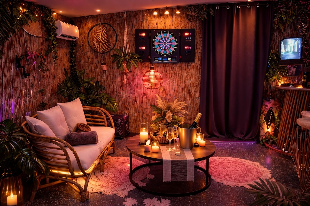 ✨ Odkrijte Mirage Tropical, prefinjeno oazo na obrežju reke Loare 🌴. Uživajte v spa, masažni mizi, elegantni terasi in eksotičnem območju džungle, da se odmaknete od vsega. Zabavajte se ob igri pikada, si privoščite eksotični aperitiv ali pa se sprostite v edinstvenem vzdušju. Zvečer se soba zasveti z očarljivimi barvami, ki ustvarijo eleganten in romantičen trenutek💖. Vsaka podrobnost bo poskrbela za nepozabno bivanje.🌴❤️❤️💕💕💕👄🫂❤️
