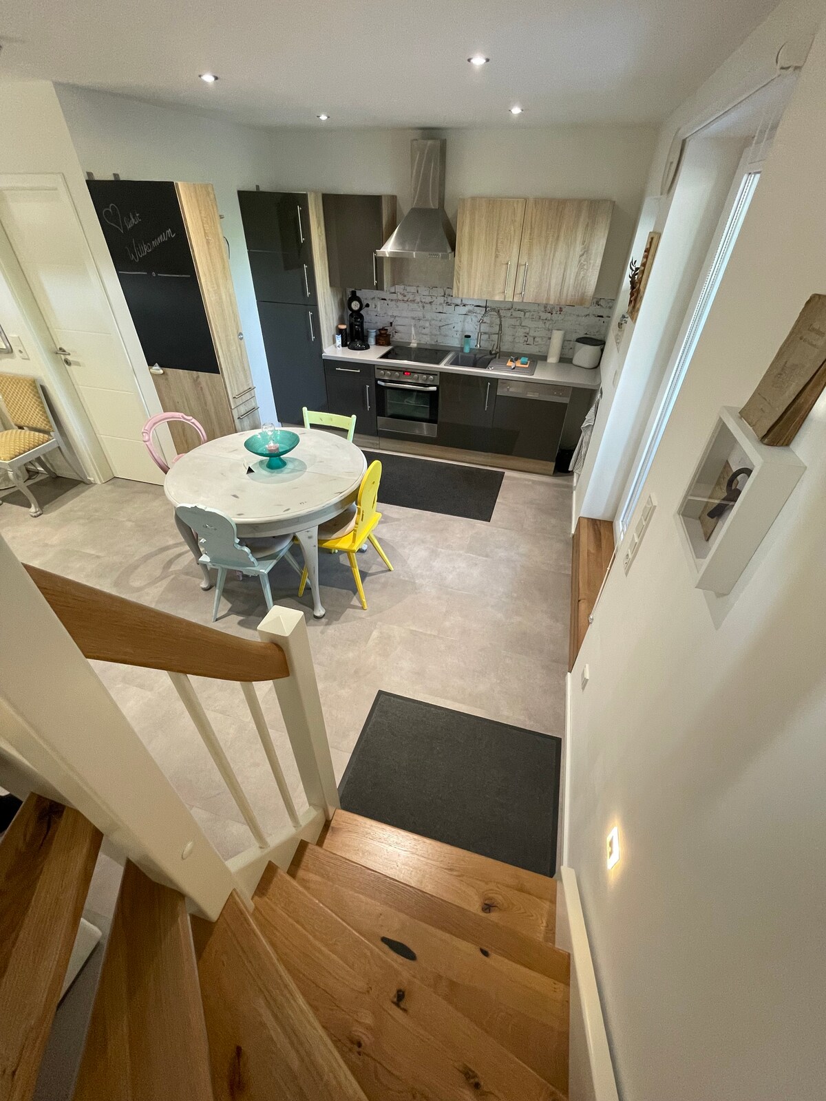 "Tiny Häuschen" in der Innenstadt von Bad Bergzabern. Das Häuschen besteht es aus einem hohen, hellen, offenen Raum mit einer Empore. Unten ist der Wohnbereich, das kleine funktionelle Bad mit Dusche und eine offene Küche, oben befinden sich die Betten. Am großen Esstisch oder in den beiden gemütlichen Sesseln mit Poufs für die Füße machst du es dir gemütlich. Das Häuschen ist das ideale schicke "Basislager" für Naturerlebnisse im Pfälzer Wald, Touren ins nah gelegene Elsaß, die Weinberge u.v.m.
