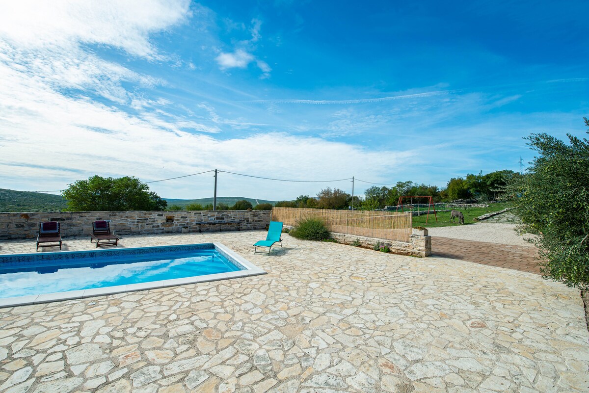 Kamnita podeželska hiša Irena z bazenom na velikem profesionalcu