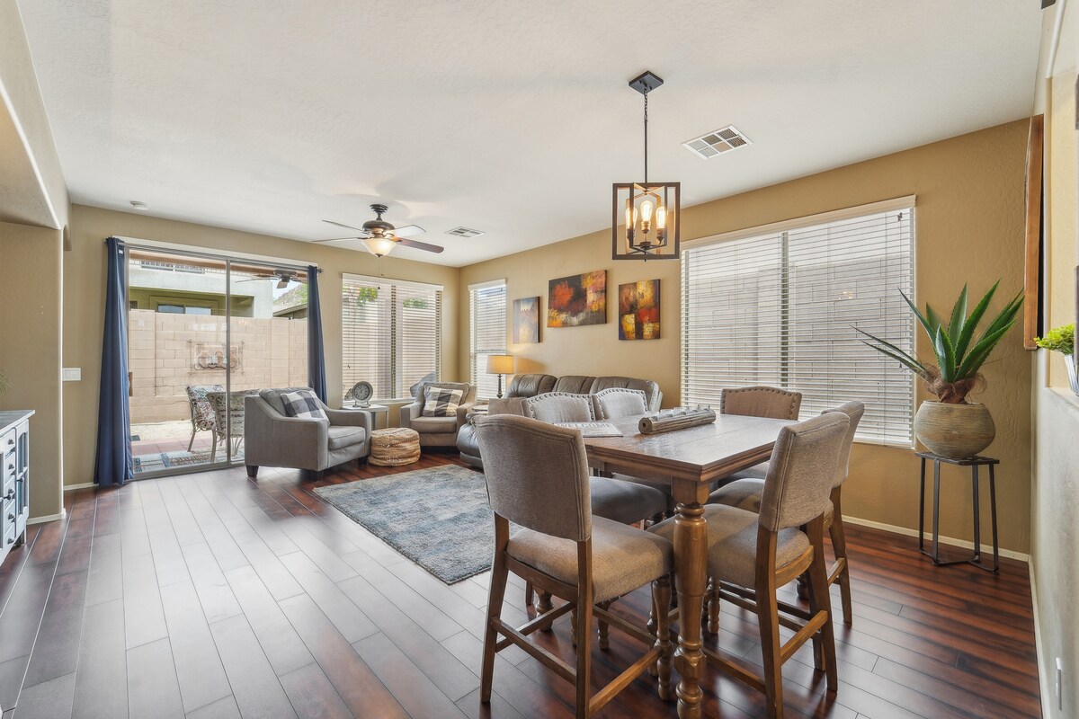 Dobrodošli v naši toskanski oazi v puščavi Sierra Gated Community! Doživite privlačnost toskanskega prenočišča v tem čudovitem prenočišču s 4 spalnicami, 3 kopalnicami, 2 dnevnima sobama, pisarno, zasebno teraso z ognjiščem, žarom in mini golfom. Dostop do bazenov v soseski, masažne kadi, košarke, teniških in odbojkarskih igrišč. Blizu pohodniških, kolesarskih poti in jezera Pleasant. Naše prenočišče se nahaja le 25 minut severno od središča Phoenixa in ponuja popolno mešanico razkošja, udobja in priročnosti.