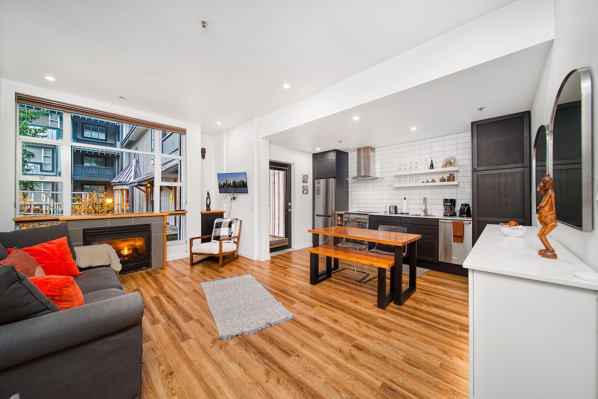Modern Scandi 1 bd in quiet Creekside. 3 min walk to Gondola. Adjacent to the Valley Trail. Heated floors, Rain shower, 50" Smart TV, High-Speed Wifi, Fireplace, Private Ski Rack & FREE parking. Creekside Village across the street for bike rentals, groceries, gym...Choose from fine dining (Rimrock, Red Door, Mekong), comfort food (South Side, Creekbread), pubs ( Roland's, Dusty's) and cafes (BReD, Rockit). 7 min drive/ bus ride to Main Whistler Village. Public transit is 2 minutes from door.