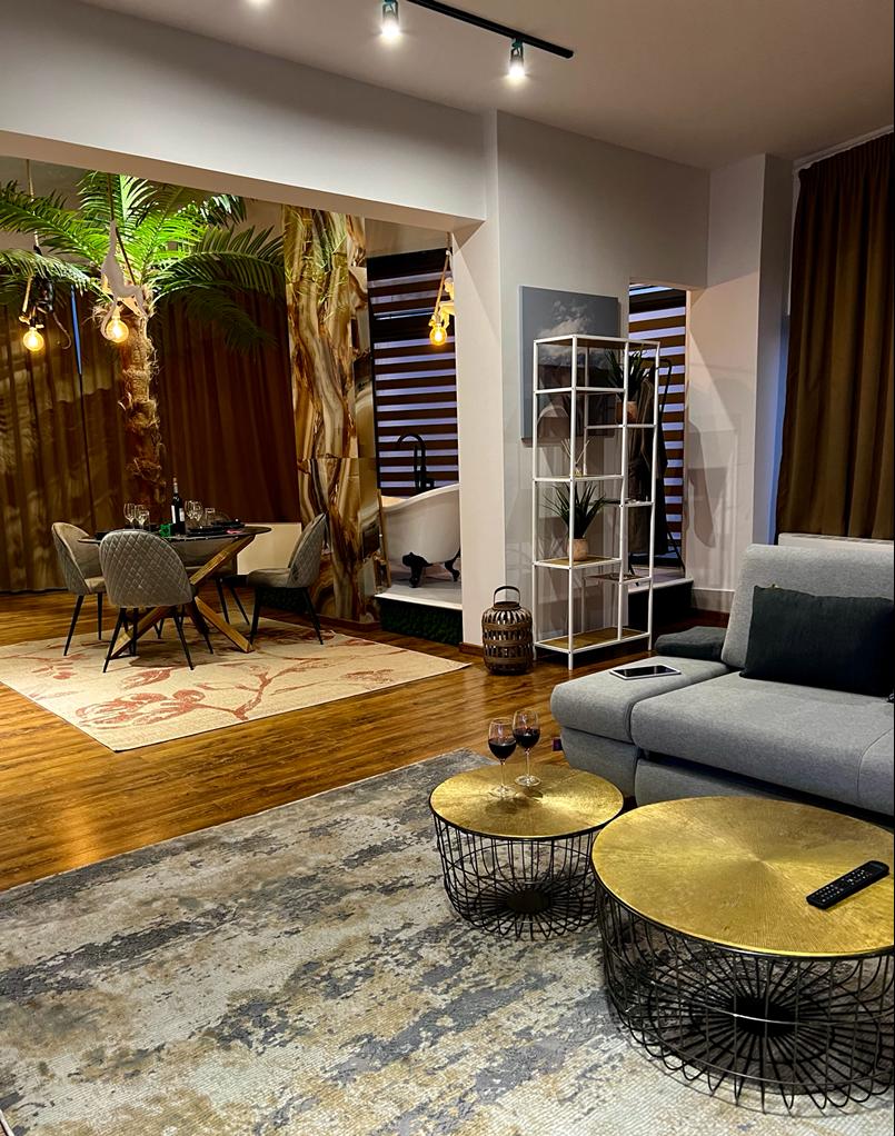 Romantično in udobno stanovanje z najrazličnejšo opremo za najbolj in najbolj sproščujoče bivanje. Opremljen je s pametnim televizorjem, dodatnim glasbenim zvokom, pametnim nadzornim sistemom, tabličnim računalnikom in razsvetljavo. Jedilnica in kuhinjska niša s popolnoma opremljenim prostorom sta jedilnica, opekač kruha, čajnik, aparat za kavo in potrebščine zanje. Kopalna kad v dnevni sobi s panoramskim razgledom na mesto in sončne zahode. Spalnica s prostorom za ličenje in pametno televizijo. Celotno stanovanje ima panoramski razgled.