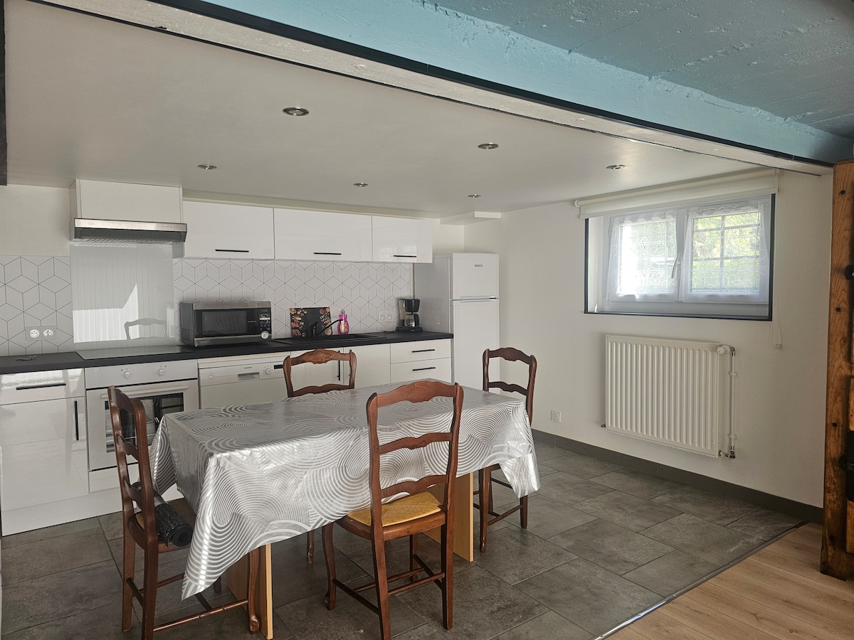 Očarljiva polmerna hiša velikosti 60 m², ki se nahaja na podeželju. Odličen kraj za polnjenje baterij v tišini in zelenju Podeželska dekoracija in zelo popolna oprema Postelje so pripravljene ob vašem prihodu Možen samostojni vstop Trgovine in restavracije, dostopne z avtomobilom Posebej zasnovano za bivanja, ki trajajo od nekaj dni do več mesecev Novo: hiša je zdaj znana po Fiberju, ki vam omogoča, da delate v dobrih razmerah