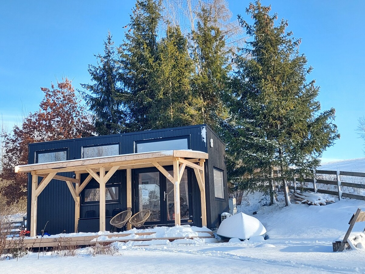 Bivali boste v ločeni leseni hiši, ločeni od ostalega dvorišča. Čista narava. S terase imate čudovit oddaljen razgled na hribovito travnato pokrajino. Tam boste uživali tudi v sončnih zahodih. Do dvorišča je 25 m, kjer lahko uporabljate tudi zimski vrt in bar ter teraso ob jezeru. Hiša je ogrevana s kaminom, ki oskrbuje tudi zgornje nadstropje z letalskimi vlaki. Poskrbeti boste morali za osvetlitev.