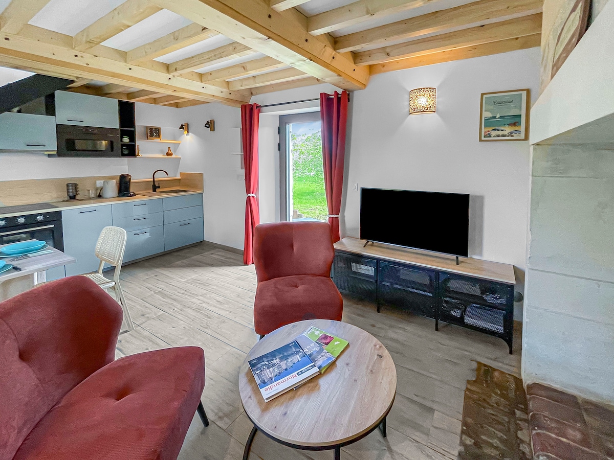10 km od Bayeuxa in 20 km od pristajalnih plaž, v idiličnem kraju, obdanem z gozdom in profesionalnim hlevom, ponujamo popolnoma opremljen neodvisen studio s kuhinjo, spalnico s prho, TV, Wi-Fi in raztegljiv kavč Gostje lahko brez dodatnih stroškov uživajo v prostoru za sprostitev na verandi z masažno kadjo in telovadnico ob rezervaciji (1 ura na dan). Veliko parkirišče, ki lahko sprejme velika vozila