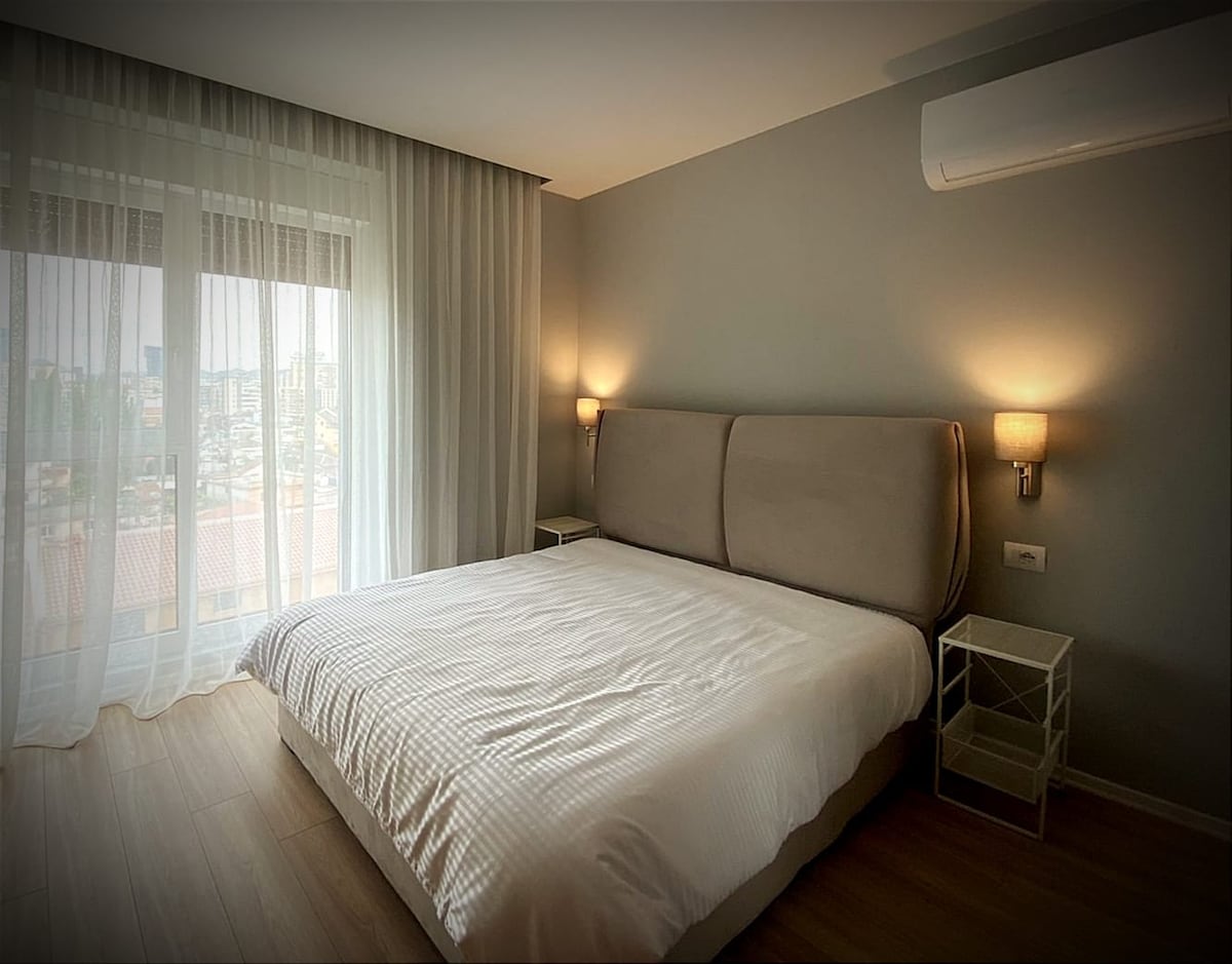 Novo opremljeno posebno stanovanje v osrednji Tirani (5 min hoje od trga Skanderbeg). Med obiskom udobno uživajte v mirnem sodobnem sproščujočem prostoru Stanovanje v 4. nadstropju in nima dvigala, zato razmislite o tem. Lahko vam pomagamo s torbami. Bazen, telovadnica, savna 2 minuti hoje v hotelu Black Diamond Pohištvo in zasnova sta namenjena največjemu udobju Območje je varno in mirno 8 minut hoje od centra in glavnega javnega prevoza ter prevoza do letališča ali katerekoli glavne lokacije