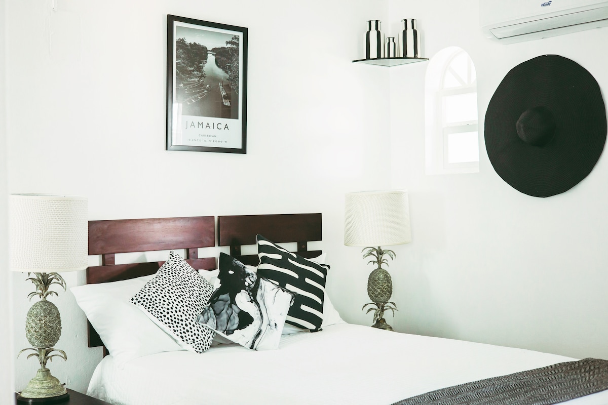 Sodoben STUDIO v pritličju in stanovanje v čudovitem Negrilu na Jamajki. Little Bay Country Club je ograjena skupnost z varnostjo, ki je na voljo non stop, neskončnim bazenom, osamljenim zasebnim zalivom s peščeno plažo, teniškim igriščem/košarkarskim igriščem in novo odprto priročno trgovino. PLAŽA IN BAZEN STA ODDALJENA LE KRATEK SPREHOD OD ENOTE (približno 3-4 min.) do skrbno urejene skupnosti. Bazenski plavajoči bazeni in vsi vozički za prevoz opreme za plažo z lahkoto in opremo za potapljanje so na voljo gostom te namestitve.