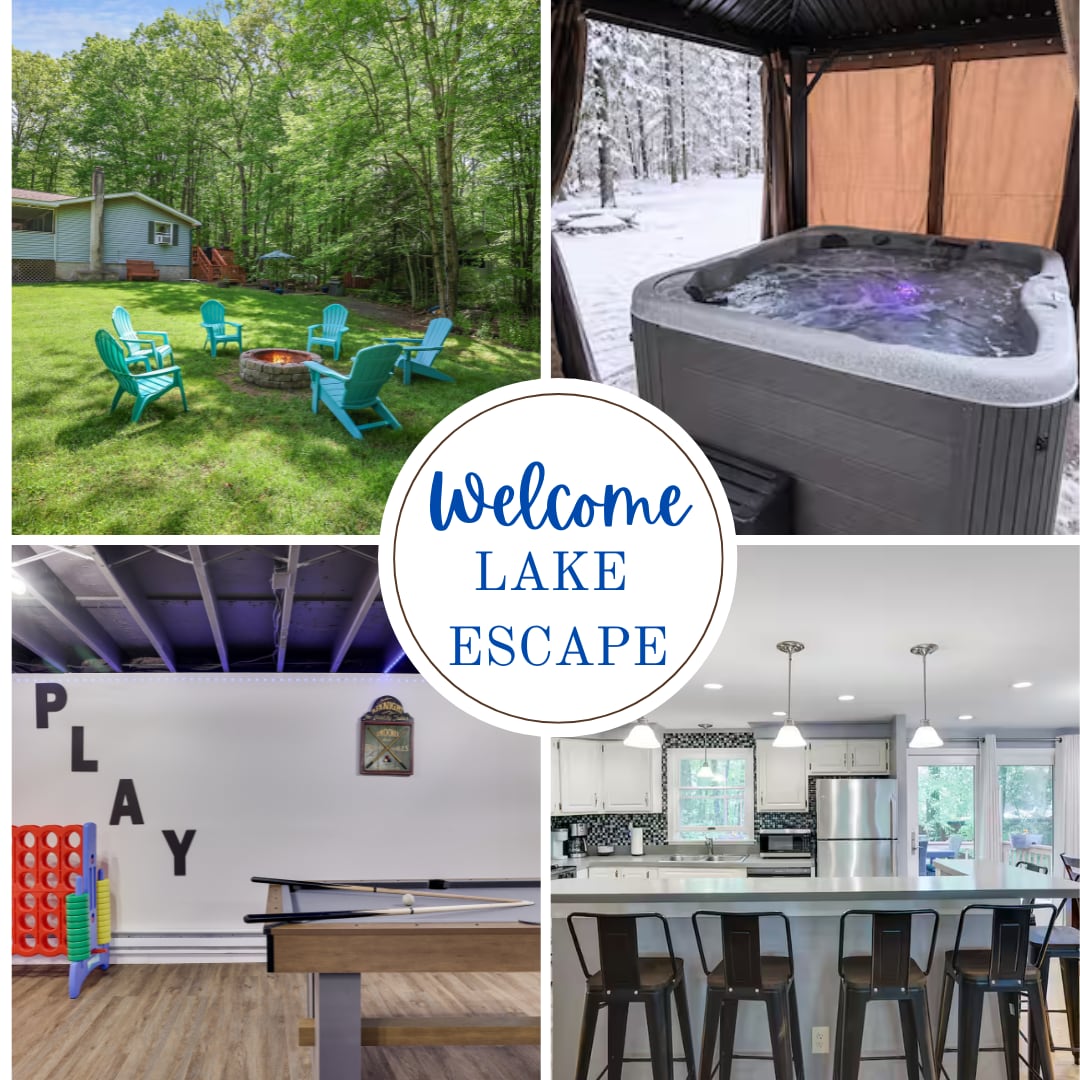 Spacious 2000 sq ft layout for families: ➨ 1 King bed, 2 Queen beds, triple Twin-mattress bunk bed ➨ Fully stocked kitchen w/ coffee bar ➨ Game room w/ Air Hockey and Foosball ➨ Private hot tub, fire pit & BBQ grill ➨ Close to Lake Wallenpaupack & local attractions Prime Location: ➨ 5 miles to Lake Wallenpaupack ➨ 20 miles to Big Bear Ski Resort ➨ 15 miles to Claws N Paws Wild Animal Park ➨ 11 miles to PA Rail Bike Trail ➨ 6 miles to Costa's Family Fun Park ➨ 6 miles to Promise Land State Park