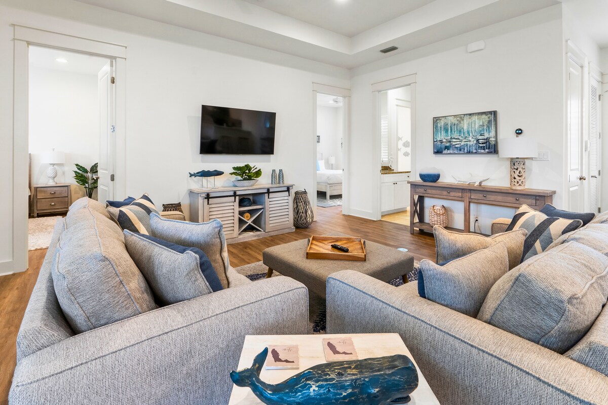 6-Seater GOLF CART INCLUDED! This darling home features designer furnishings and high-end finishes throughout. Enjoy a charming outdoor space with a back porch, BBQ grill, and 2 bikes—all just a short walk to the beach, right in the heart of the Brickyard area of Blue Mountain Beach! Inside: open-concept living + dining, a fully equipped kitchen with quartz counters, island seating, and Sonos speakers. Beach essentials: – 4 beach chairs – Beach umbrella – 4 beach towels – Backpack cooler
