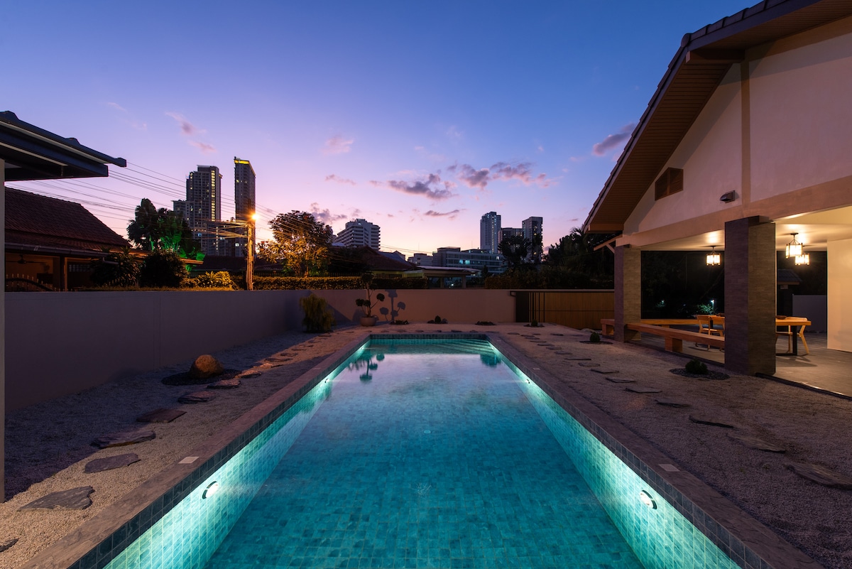 Luksuzna vila z bazenom, ki je priljubljena kot gostom, kot nalašč za družine, skupine prijateljev ali popotnike, ki iščejo zabavo. Kopalnice v spalnici. Zasebni bazen za lene popoldneve. Šampon in gel za prhanje, brisače so na voljo. Žar, karaoke in biljardna miza. Klimatska naprava v notranjih prostorih. Ta vila je 6 km vožnje oddaljena od plaže Pattaya in ulice Walking Street. Avtomobili v aplikaciji GRAB or BOLT so na voljo non stop, tudi ob 4-6.00 (po času zabav). Delili si bomo kraje za obroke, pijačo, turistične kraje, nočne dogodke in skrite kotičke.