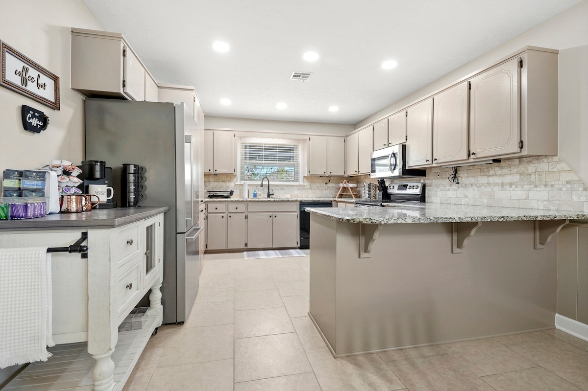 »Dobrodošli v Jeanino hišo! Ta udobna hiška ima 3 spalnice, 2 kopalnici in dodaten kavč. Ta hiša je oddaljena 12 minut vožnje do industrijskega parka Mid America. Nahaja se peš od dveh znanih restavracij v Chouteauju, nizozemske shrambe in amiške hiše s sirom. Pekarna Nettie Ann je tik ob amiški hiši sira. Notri je garaža za parkiranje vašega vozila, druga garaža pa je na voljo, če nas o tem vnaprej obvestite.«