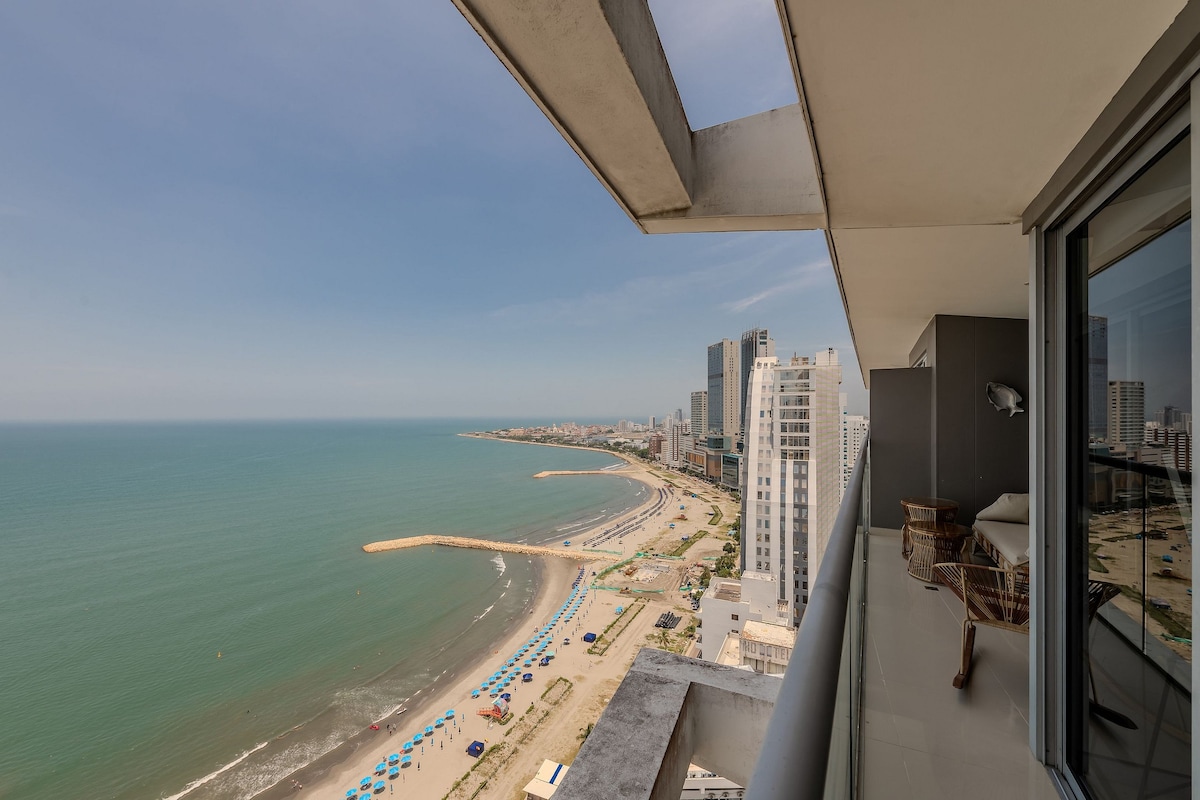 Očarljiv 66m2velik studio v 26. nadstropju mesta Morros z neverjetnim razgledom na Karibsko morje in zgodovinsko središče. Nahaja se v Bocagrandeju pred plažo in ima zakonsko posteljo, dnevno sobo z raztegljivim kavčem, balkon z zunanjo mizo, polno kuhinjo, pralni in sušilni stroj. Hiter Wi-Fi. Luksuzna oprema: bazen, masažna kad, turška kopel in telovadnica. Brezplačno parkiranje. Idealno za pare ali popotnike, ki iščejo vrhunsko lokacijo z očarljivim razgledom v najbolj ekskluzivnem turističnem središču Cartagene.
