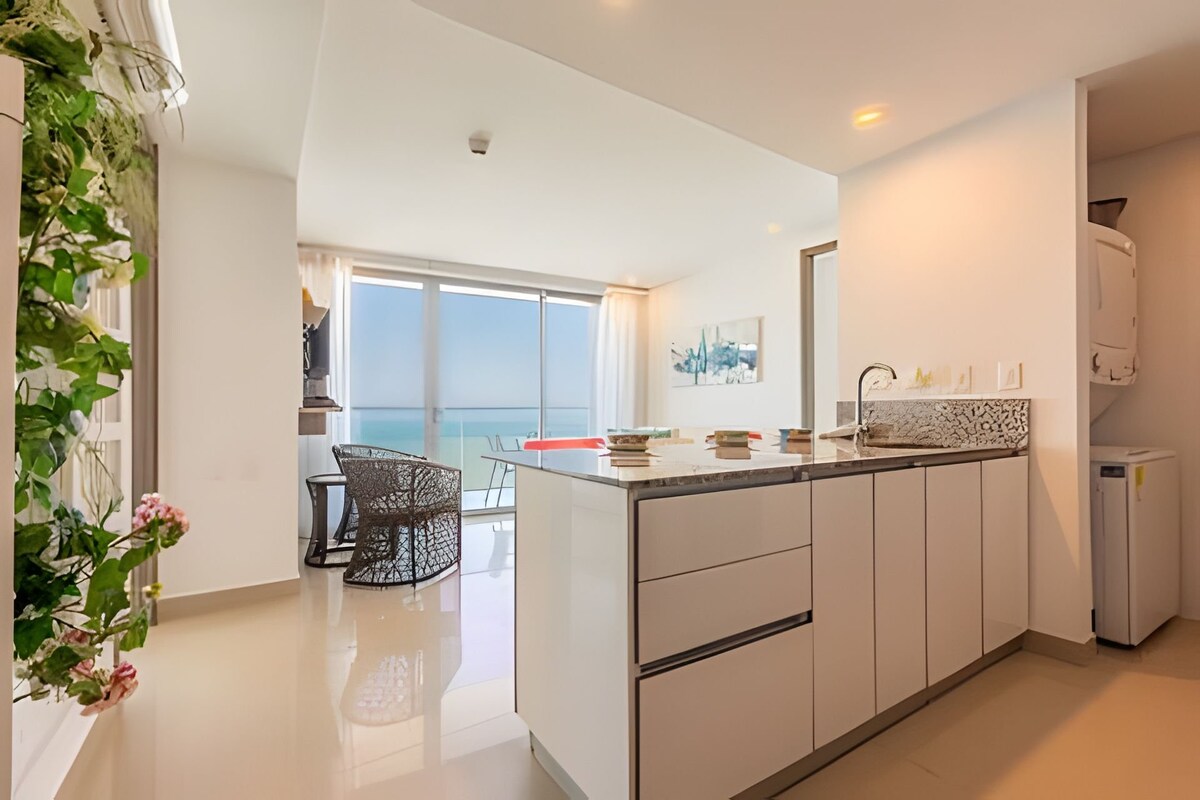 ✨ Welcome to your retreat in Cartagena: a luxury high-floor apartment facing the sea, with two private balconies and a 180° panoramic view of the Caribbean and the bay. Designed for your comfort, it features a modern living room with floor-to-ceiling windows, a fully equipped kitchen, fast WiFi, and digital check-in. Enjoy the infinity pool, poolside bar, and ocean-view gym. Located in Bocagrande, steps from the beach and minutes from the Walled City. 🌊🌴