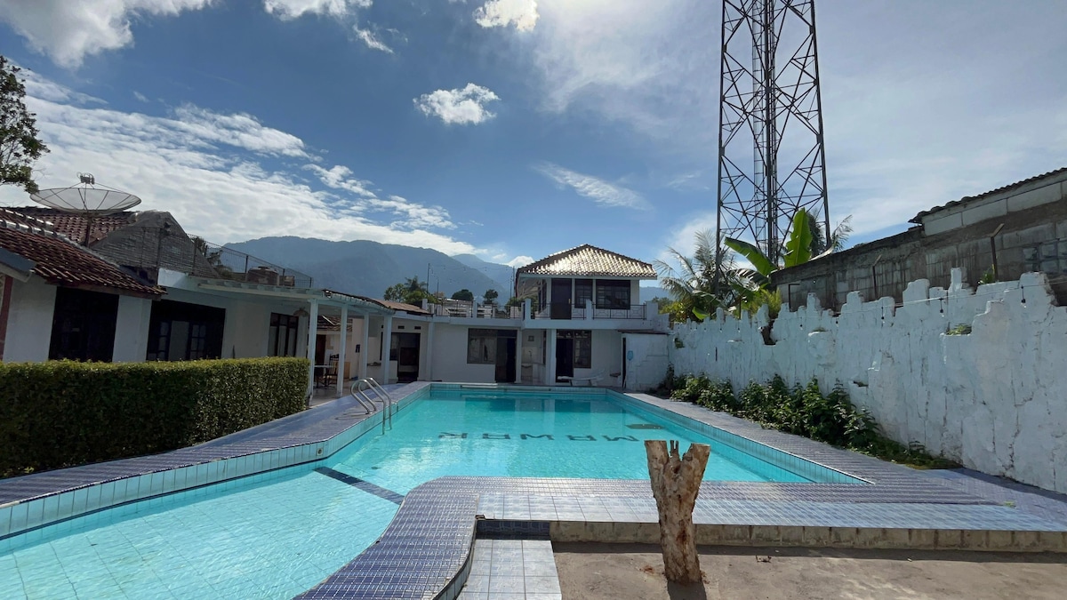 Predstavljamo vam vilo Amerta – vaše popolno bivanje za največ 25 gostov. Ta 5-sobna soba z zasebnim bazenom, žarom in kinom/karaoke sobo je kot nalašč za družino, prijatelje ali posebne dogodke. Naša vila se nahaja na priročni lokaciji z alternativnim dostopom do ulice in se nahaja v mirnem kompleksu, kar zagotavlja mirno bivanje. Ne zamudite osupljivih razgledov z naše strehe, ki prikazujejo lepoto gora Pangrango in Salak. Rezervirajte zdaj za nepozabno doživetje!