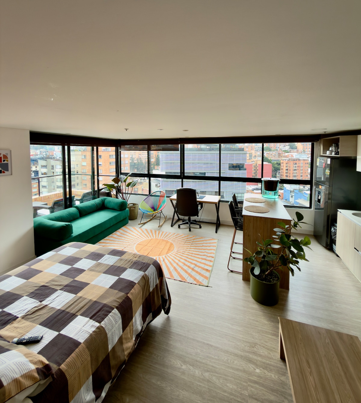 Despierta con los Cerros Orientales frente a ti. Nuestro loft está ubicado en el edificio más icónico de Chapinero, una torre de vidrio que captura la ciudad desde todos los ángulos. El apto combina diseño, amplitud y luz natural en un solo espacio. Ventanales de piso a techo, terraza privada, wifi de 600 Mbps y zona de trabajo para quienes mezclan viaje con productividad. Afuera, todo Chapinero a pie: Parque de los Hippies, Carrera7, restaurantes de autor, cafés de especialidad y vida nocturna.