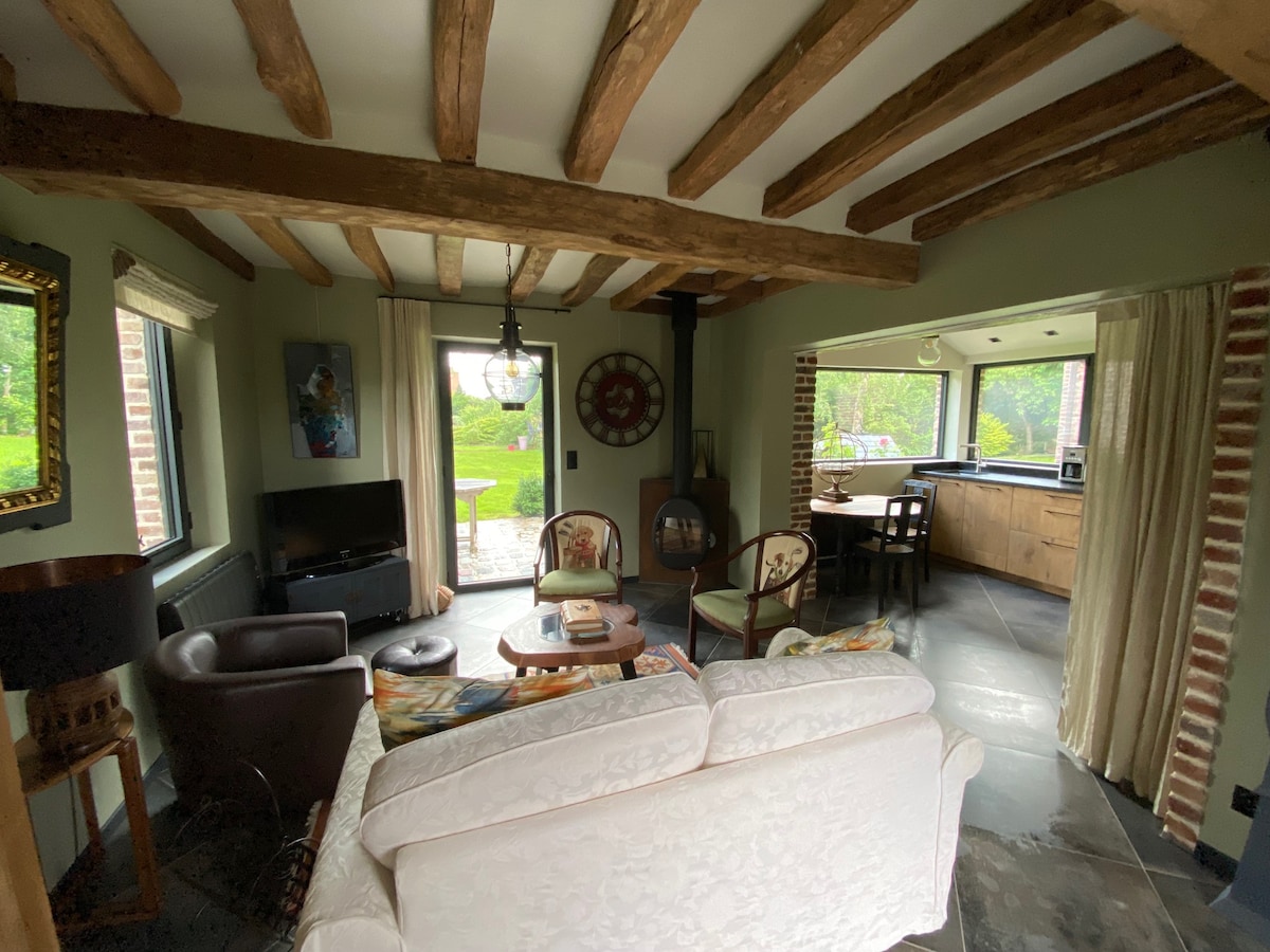 Uživajte v elegantni in osrednji nastanitvi. Vaška hiša: 1 dnevna soba s kaminom (na voljo je les), popolnoma opremljena kuhinja (pomivalni stroj, mikrovalovna pečica, grelnik vode, opekač kruha itd.), sončna terasa, 1 spalnica 160 x 200, 1 spalnica z 2 posteljama 90 x 200 (možen je senčnik/otroški stol), kopalnica (kad), ločeno stranišče, Wi-Fi, miza in otroški prostor. To prenočišče je bilo pravkar popolnoma obnovljeno. Zelo mirno. Veliko dejavnosti v okolici (konjeništvo, pohodništvo, kolesarjenje, različne trgovine).