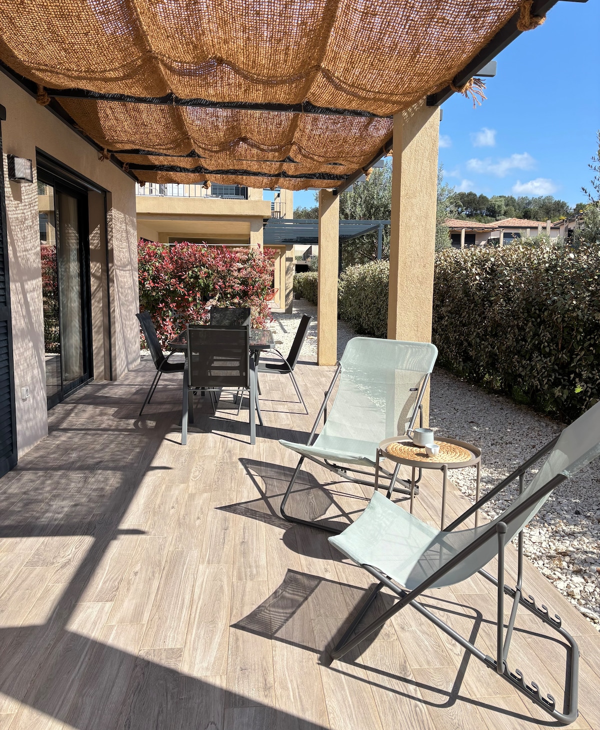 mini dupleks vila v lepi rezidenci tik ob vodi, 30 m od morja z neposrednim dostopom 2 terasi s pogledom na morje 45 m2 od 2/5 oseb (največ 4 odrasli) v pritličju : terasa z vrtnim pohištvom za kosilo dnevna soba z 1 zakonsko posteljo (in 1 pogradom za 1 otroka), opremljena kuhinjska niša, kopalnica s prho, umivalnik ločeno stranišče v 1. nadstropju: glavna spalnica z zakonsko posteljo, čudovita solarij terasa s pogledom na morje OSNOVNI AVTOMOBIL dovoljen samo 1 hišni ljubljenček