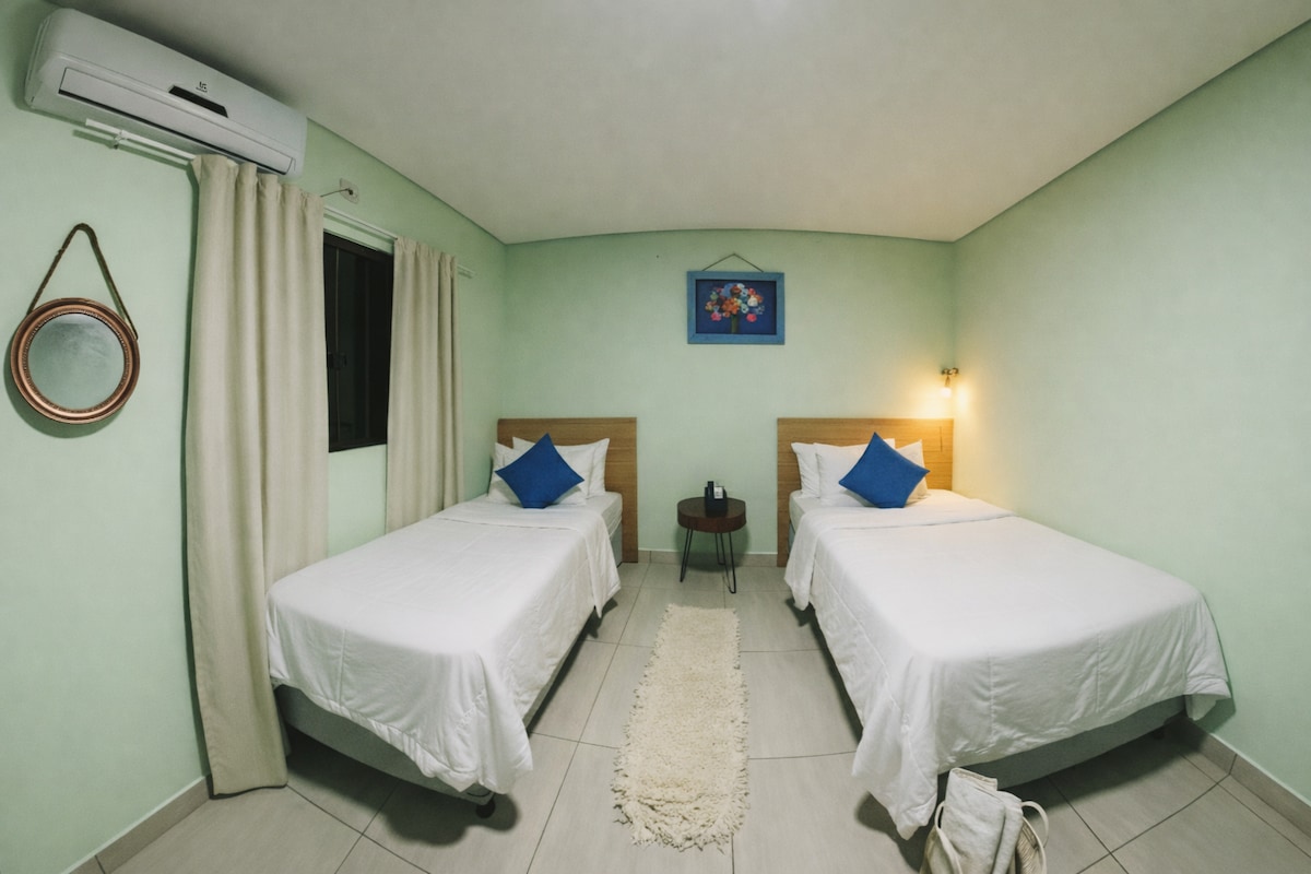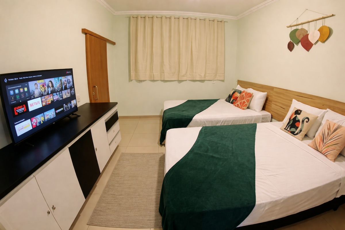 Suíte tripla confortável em Bonito MS, ideal para até 3 pessoas. O quarto conta com cama de casal e cama de solteiro, ar-condicionado, TV com streaming, armário, roupa de cama e toalhas. O banheiro é privativo, com chuveiro quente e secador de cabelo. A suíte oferece um ambiente simples, organizado e tranquilo. Os hóspedes têm acesso às áreas compartilhadas, como piscina, cozinha equipada d churrasqueira. A Villa Kanindé é um espaço acolhedor, com clima familiar e boa localização.