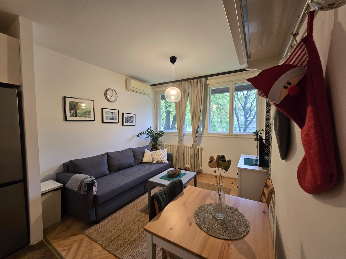 Uživajte v doživetju v tem bivališču v središču mesta, ki se nahaja v središču mesta, in s prvotno umetniškimi deli v našem stanovanju. Minimalistično in živahno enosobno stanovanje z novo kuhinjo in kopalnico, prav tako z osupljivim razgledom iz zgornjega nadstropja, kjer si lahko ogledate novi Beograd in stari Beograd v mestu sama. Naši sosedje so prijazni in gostoljubni. Nočno življenje je prav tam, zato ne smete zamuditi nobenega dogajanja ponoči in še vedno lahko mirno spite po polnoči brez glasbe.