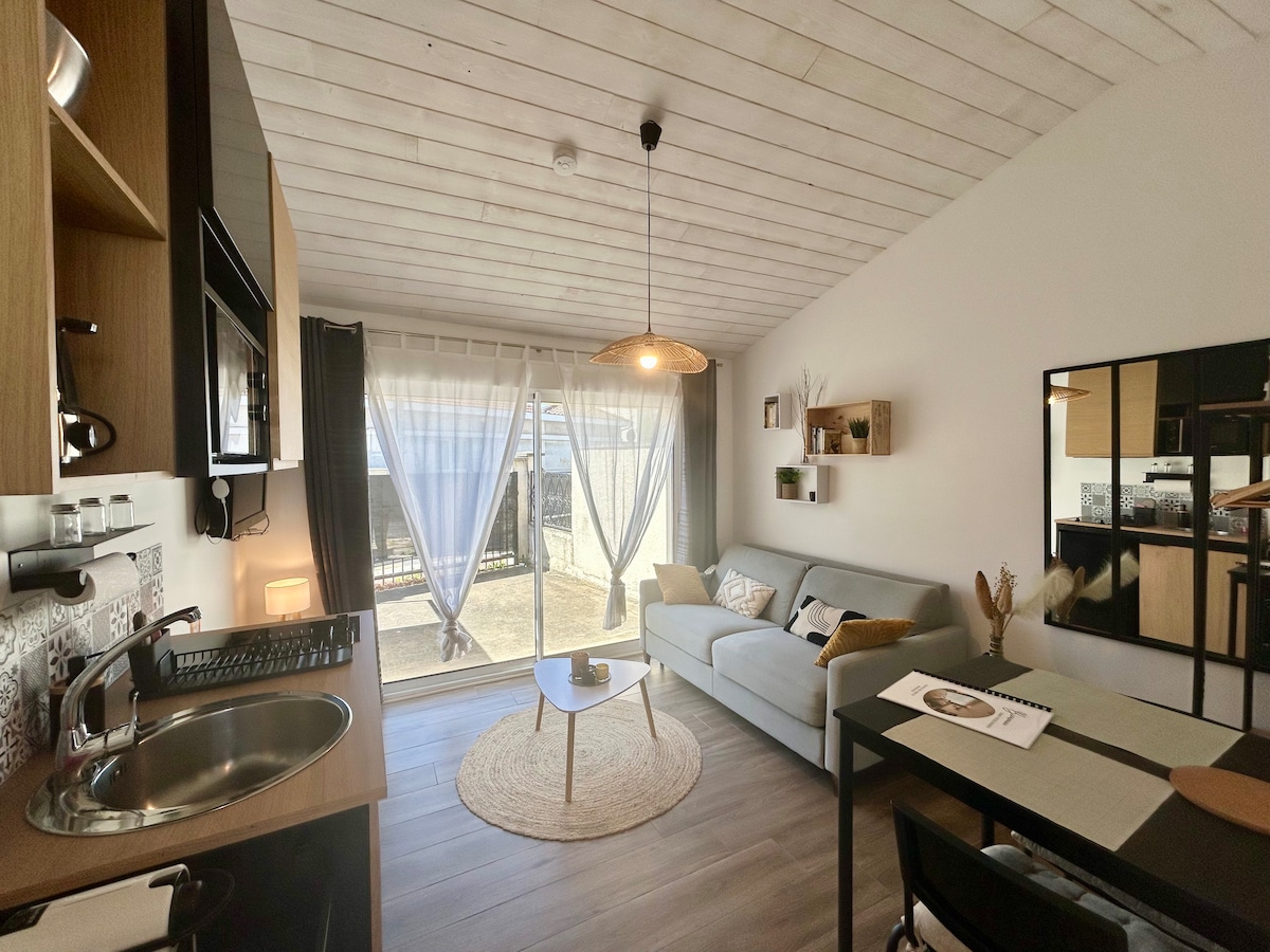 Očarljiva, popolnoma prenovljena garsonjera v velikosti 31 m², ki se nahaja na idealni lokaciji le 2 minuti hoje od tramvajskih prog C in F ter postaje Stade Musard, 30 minut od stadiona Stade Matmut, 5 minut od železniške postaje, 15 minut od središča Bordeauxa in 35 minut od letališča. ARENA 15 minut hoje. Ta nastanitev vam bo všeč zaradi udobja, miru, nepreglednosti, lokacije, terase in cvetličnega vrta 🌸 Hiša je opremljena z Wi-Fi-jem in je kot nalašč za pare, posameznike ali poslovne potnike