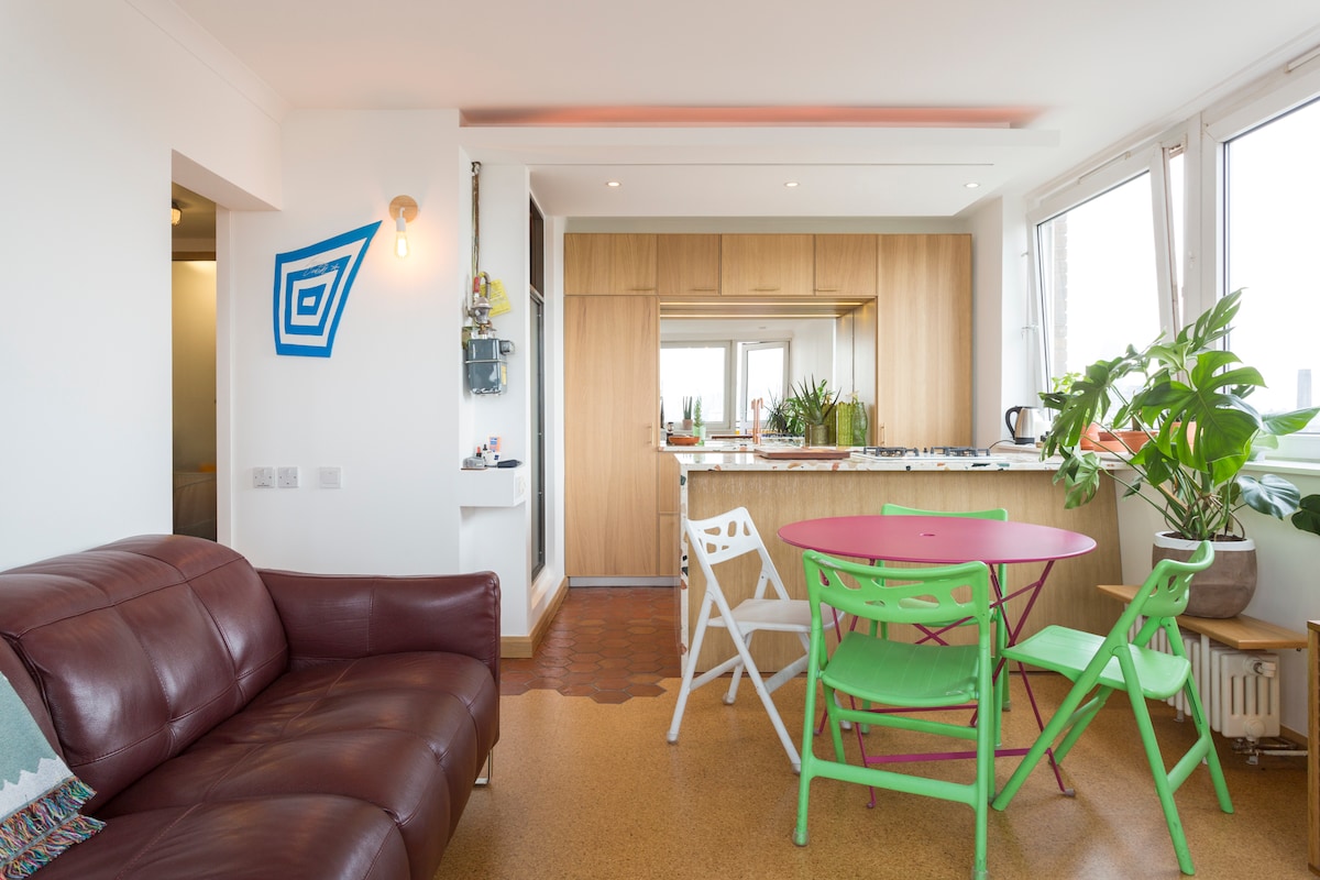 Dizajnersko podstrešje v soseski Bankside s pogledom na Temzo in zasebnim balkonom – le nekaj korakov od tržnice Borough Market in kratek sprehod do galerije Tate Modern in gledališča Globe To podstrešje s 3 posteljami v zgodovinskem predelu Bankside ima prostoren odprt bivalni prostor z dizajnersko kuhinjo iz cementa in nerjavečega jekla. Vrhunske vzmetnice, posteljnina iz egipčanskega bombaža in vrhunska oprema so kot nalašč za romantični pobeg ali za skupino sodelavcev, ki morajo deliti bivališče. Na voljo sta 2 mizi za delo.