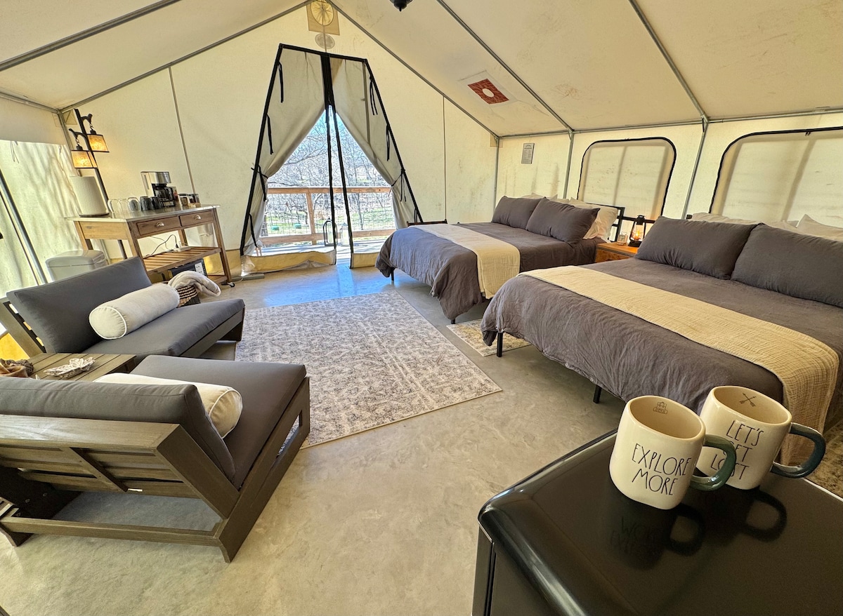 This private, cabin-style luxury glamping retreat sits directly on the river and is designed for families and dog lovers seeking comfort in nature. Enjoy a climate-controlled safari tent with a king bed, electricity, and modern amenities, big TV at Pavilion —just outside Waco and Valley Mills in the Texas Hill Country. Our luxury glamping safari tents are kid-friendly and dog-friendly, offering families and pups a safe, spacious nature retreat with plenty of room to roam, relax, and unplug…
