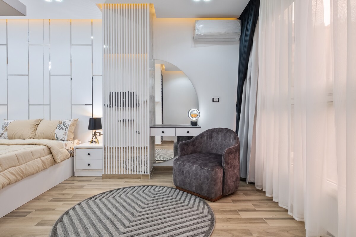 To stanovanje je idealna izbira za tiste, ki želijo živeti v mirnem in varnem območju, saj so na voljo vse osnovne storitve na območju, ki obdaja stanovanje. To stanovanje je primerno za vse namene, ne glede na to, ali iščete prenočišče za poslovna potovanja ali prosti čas. Poleg tega ima stavba odlične storitve, kot sta 24-urna varnost in vzdrževanje, zaradi česar je bivanje v stanovanju varnejše in udobnejše.