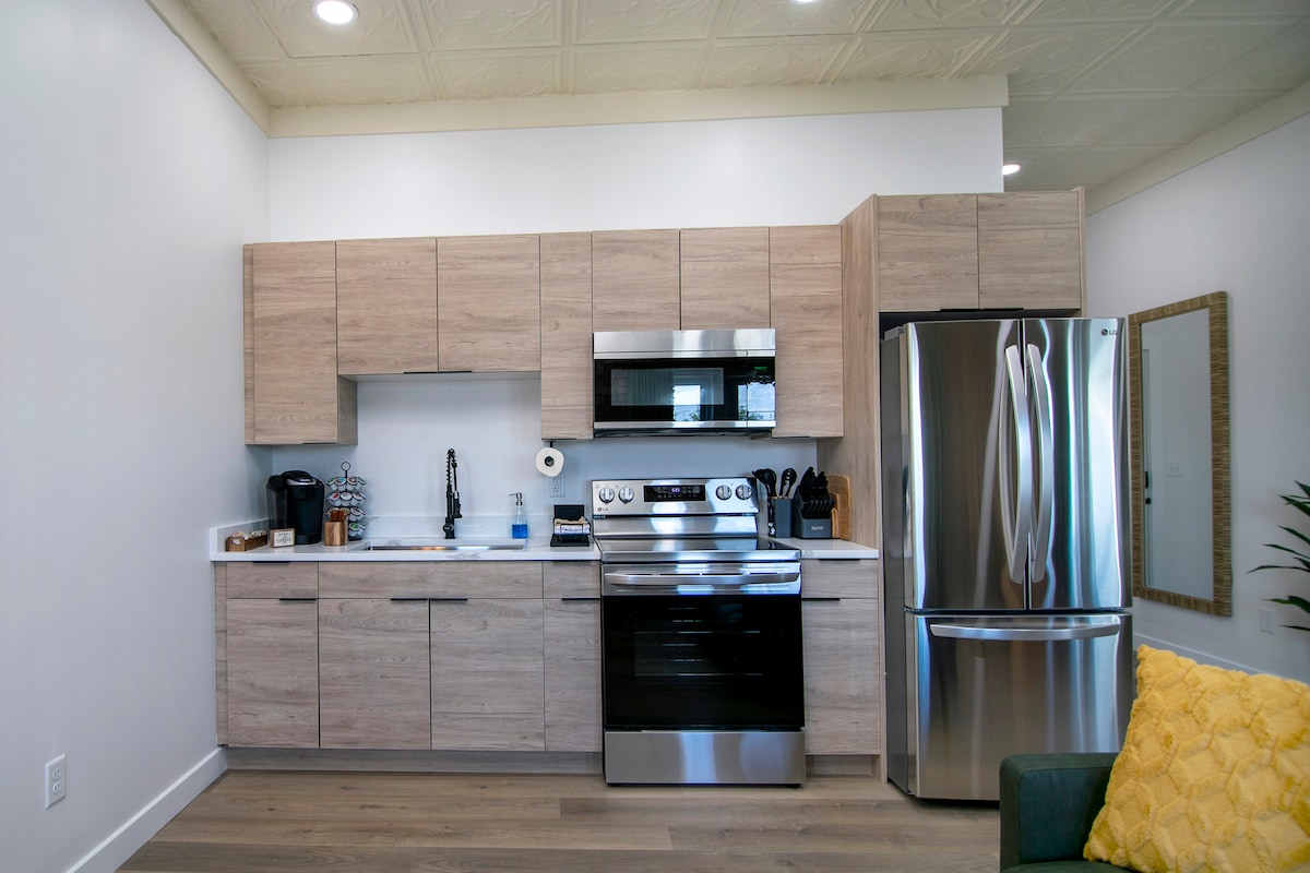 Welcome to your Boho Chic Retreat in Kankakee! This cozy studio features charming exposed brick walls and original tin ceilings, blending vintage character with modern amenities. Enjoy a fully equipped, modern kitchen and a luxurious walk-in shower. Located within walking distance to restaurants, coffee shops, bars, and entertainment, you'll have everything you need at your fingertips. Book now for a unique and stylish stay!