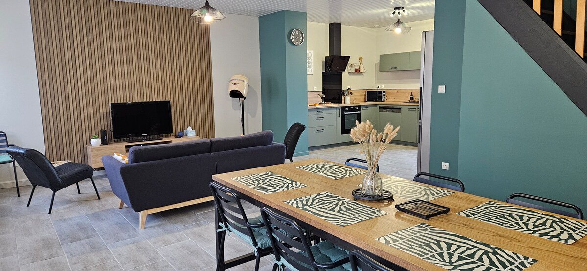 Maison d'architecte décorée avec soin et amour. Grandes pièces agréables à vivre. SPA extérieur agréable même en hiver. Belle terrasse avec pergolas. Coin détente avec filet suspendu, hamac, coin zen avec tatamis. Chambre soignée pour de doux rêves... Cuisine moderne et super bien équipée ! Lit Bébé sur demande. La maison est disponible pour des weekends, mi-week, court ou long sejour. Nos chambres personnelles et le garage sont fermés. Thé, café et petites douceurs à l'arrivée.