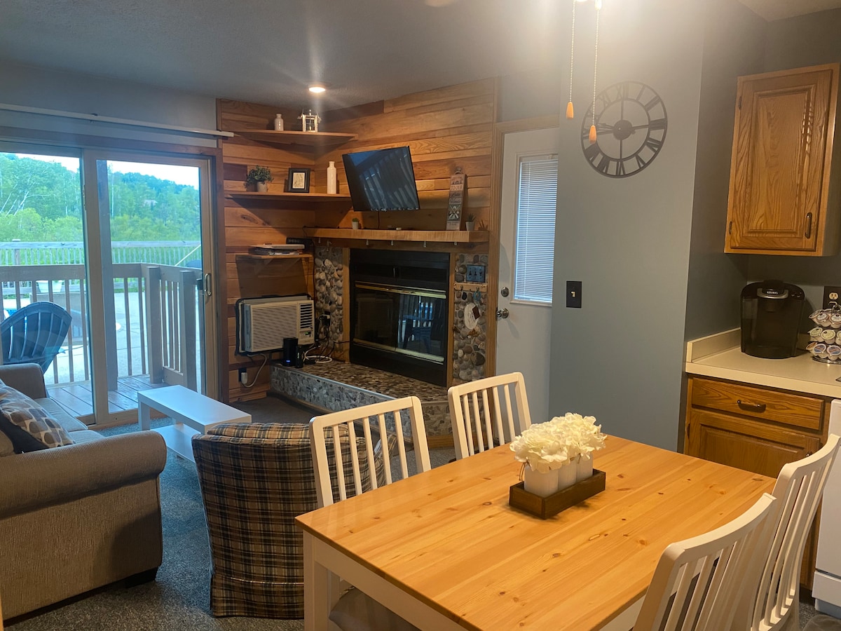 Ta 1 spalnica, 2 postelji, 1 kopalnica 605 kvadratnih čevljev za 4 osebe in se nahaja v vasi Summit Village. Stanovanje ima popolnoma opremljeno kuhinjo, kamin na drva, kavč za spanje z zakonsko posteljo in zasebno teraso za osupljive sončne zahode jezera Bellaire. Vaše bivanje vključuje dostop do več notranjih in zunanjih bazenov v letovišču ter do notranje masažne kadi. Naše stanovanje je kratek sprehod do igrišča za golf Summit, mesta Shanty in restavracije Lakeview. Bivanje tukaj pomeni, da ste v osrčju letovišča Shanty Creek!