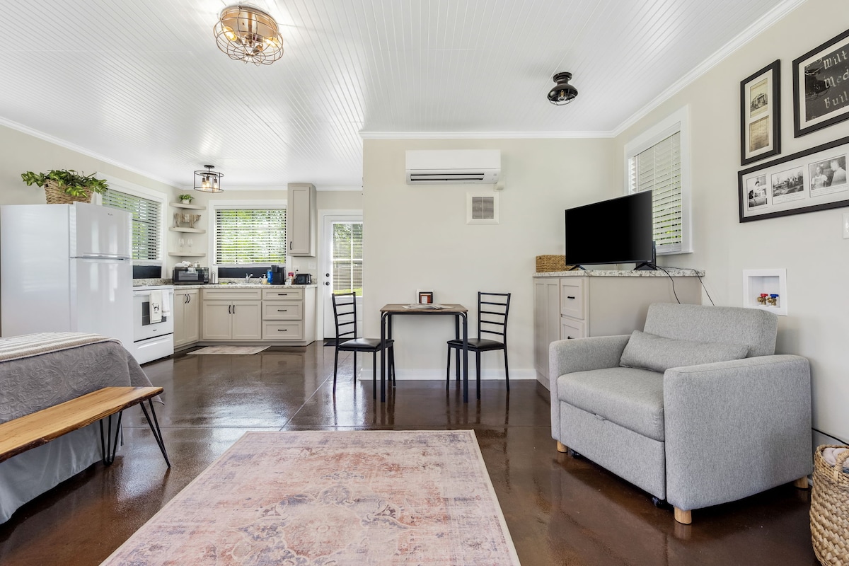 Naša udobna garsonjera je 1 postelja/kopalnica in kuhinja z vsem, kar boste morda potrebovali za bivanje. Prostorna je za potovanje sólo ali par, lepo urejena in opremljena, da bo vaše bivanje udobno. Ima svojo klimatsko napravo, lep 55-palčni televizor in lepo zakonsko posteljo. Gre za samostojni pregled v prostoru in zasebno za eno nočitev do 30 nočitev. opomba: NE gre za CELOTNO HIŠO, ampak za garsonjero, deljeno s steno.