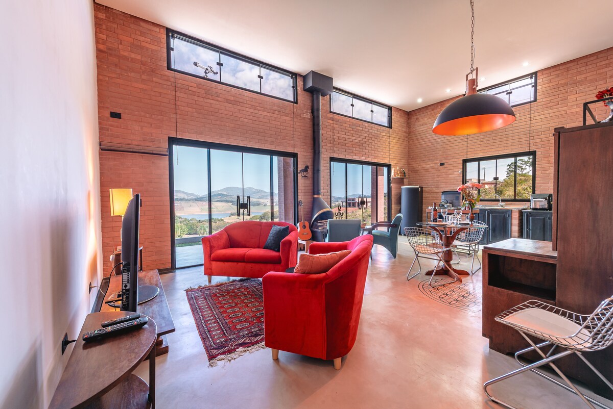 Očarljiva koča z osupljivim razgledom na jez in gore. 2 suiti, dnevna soba s kaminom, kuhinja, integrirana z dnevno sobo, straniščem, pralnico in balkon z neverjetno pokrajino. Sprostite se v ogrevanem masažni kadi s kromoterapijo, bazenu z razgledom in teraso, osvetljeno z mesečino, z ognjiščem. Wi-Fi, žar, domači pisarniški prostor in okolje, namenjeno počitku in povezovanju z osnovnimi potrebščinami. Idealno za pare, družine ali tiste, ki iščejo udobje v naravi Joanópolis, manj kot 2 uri od São Paula, 1 ura in 20 minut od Campinasa